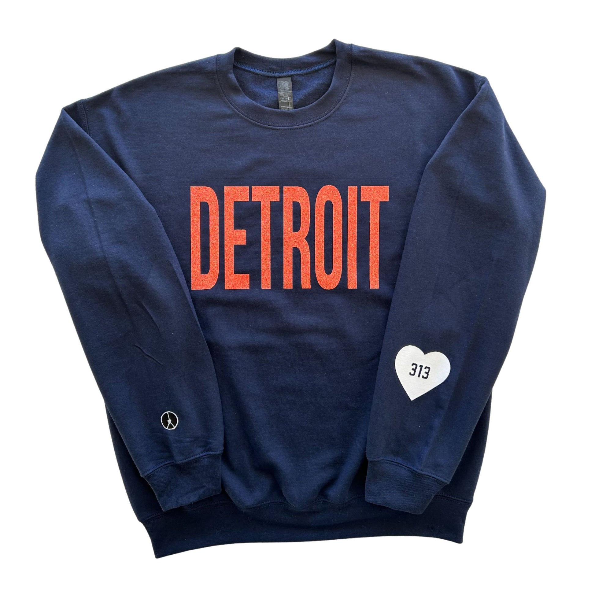 Navy crewneck with orange glitter Detroit and 313 in a heart in white