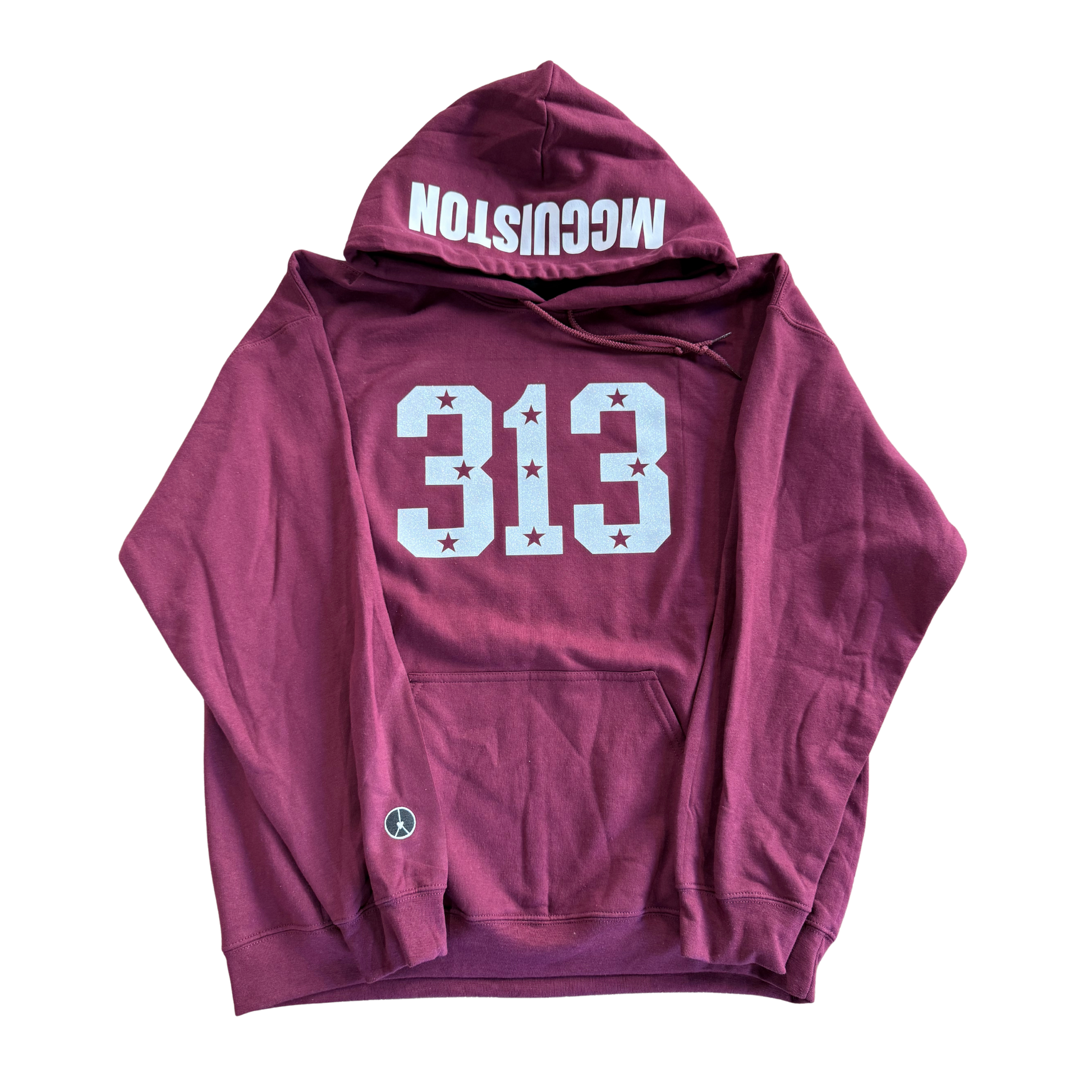 Maroon hoodie with 313 stars in white glitter and option for customizable hood in plain white