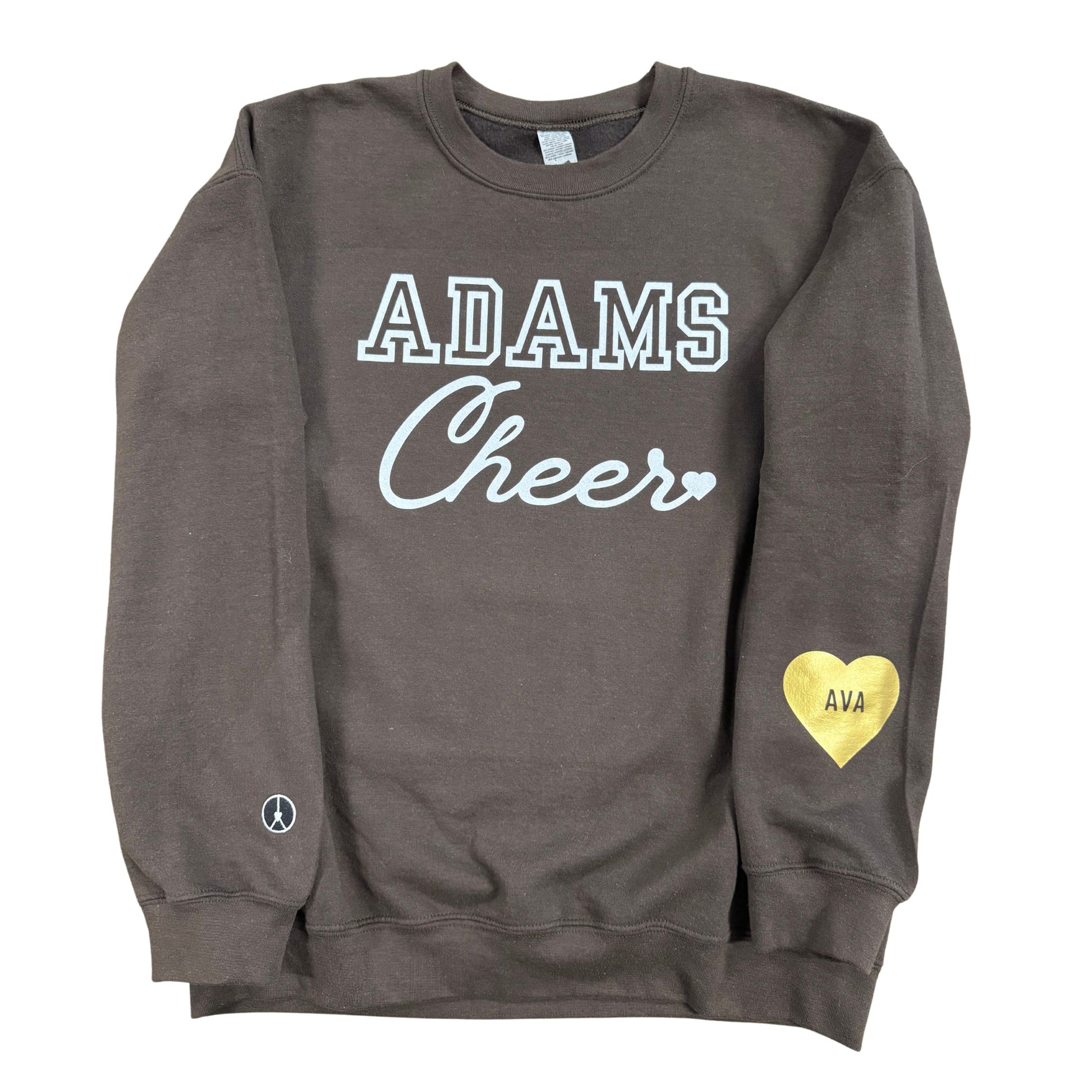 Chocolate brown crewneck with Adam's cheer and white glitter and customizable heart on sleeve