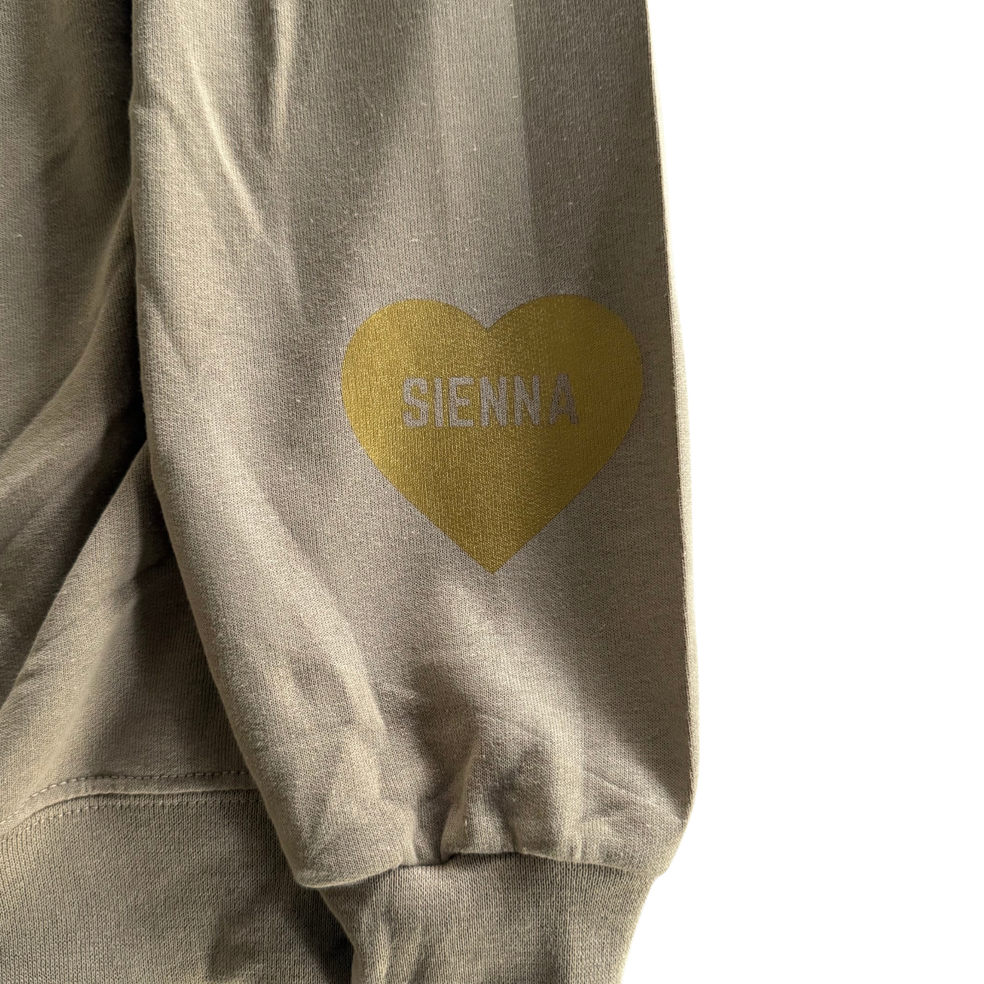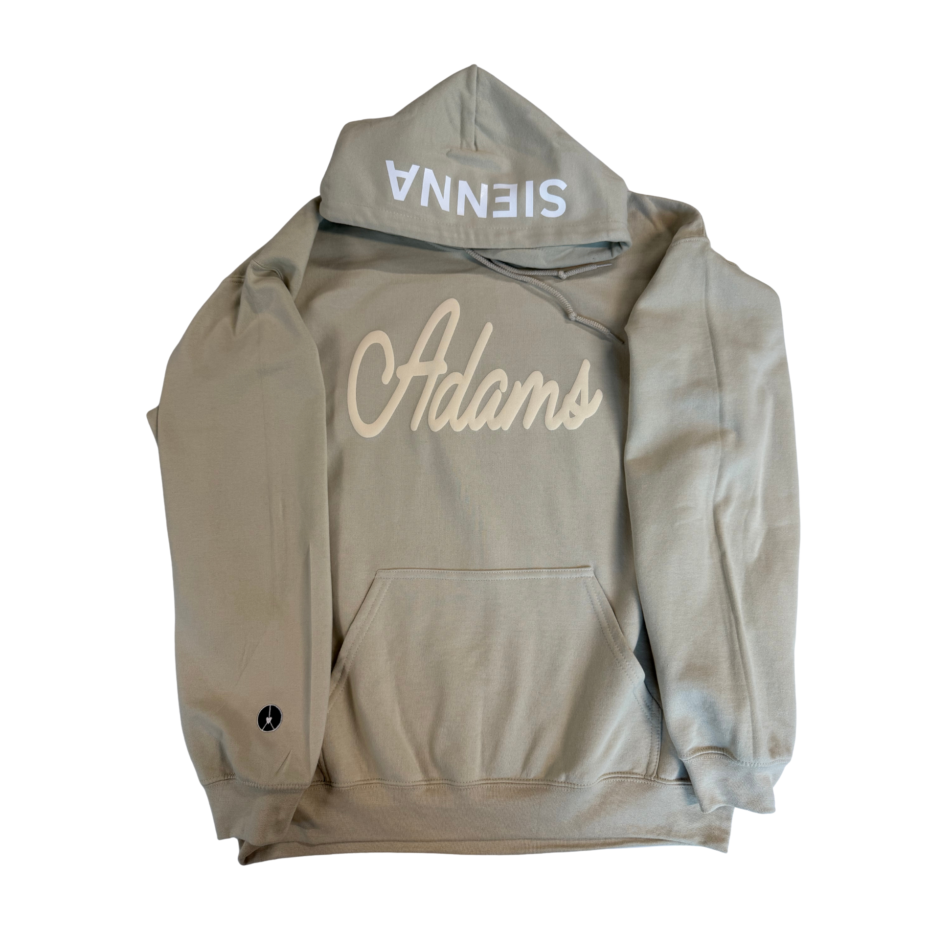 Nude hoodie with Adam's cheer, gold star patches on sleeve and customizable hood