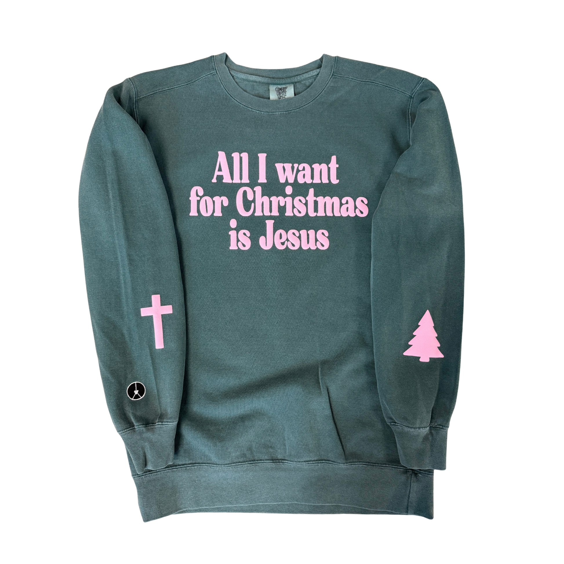 Vintage green crewneck with all I want for Christmas is Jesus and light, pink puff, Christmas tree, and cross on sleeves