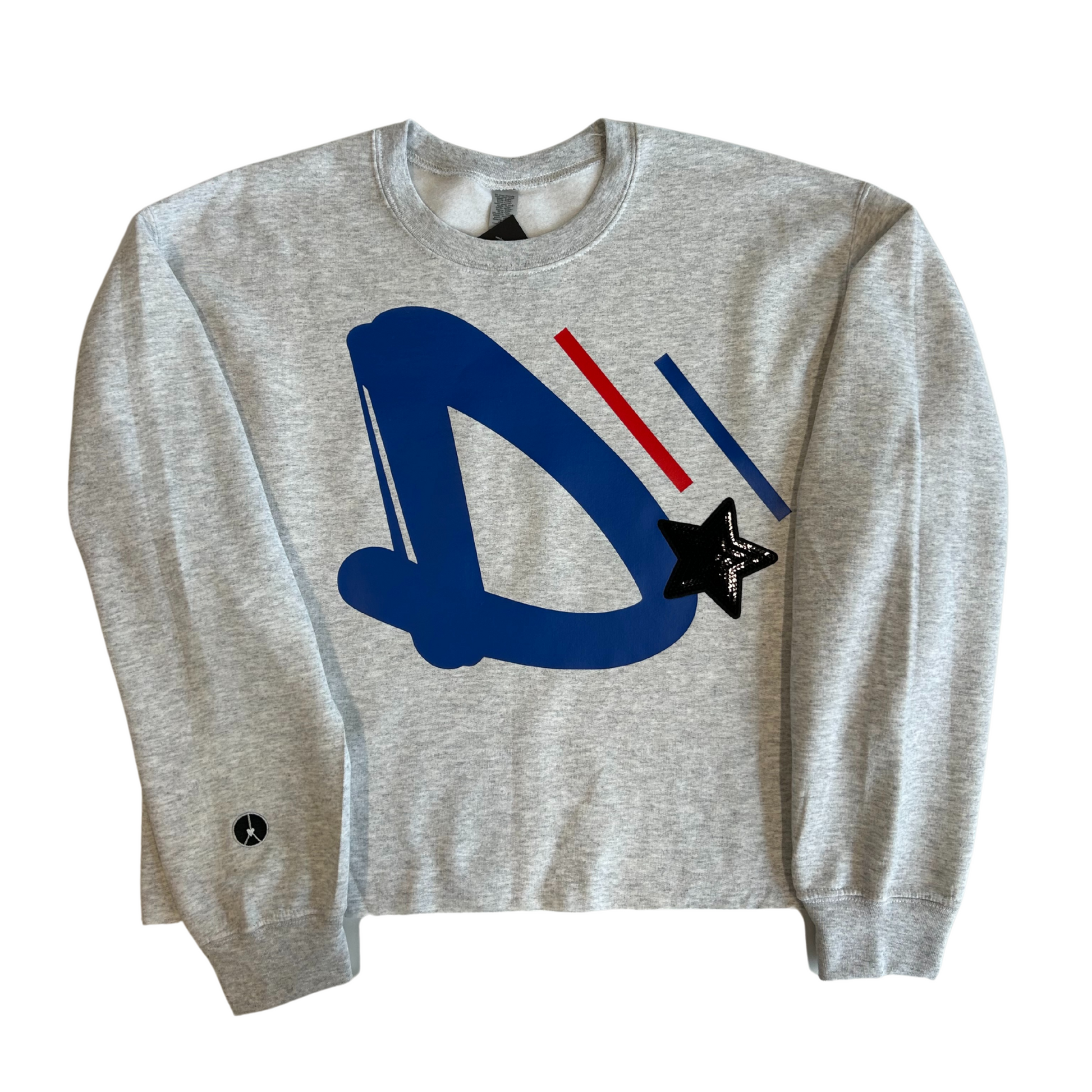 Light grey crewneck with Large Blue D and red and blue stripes with added star patch