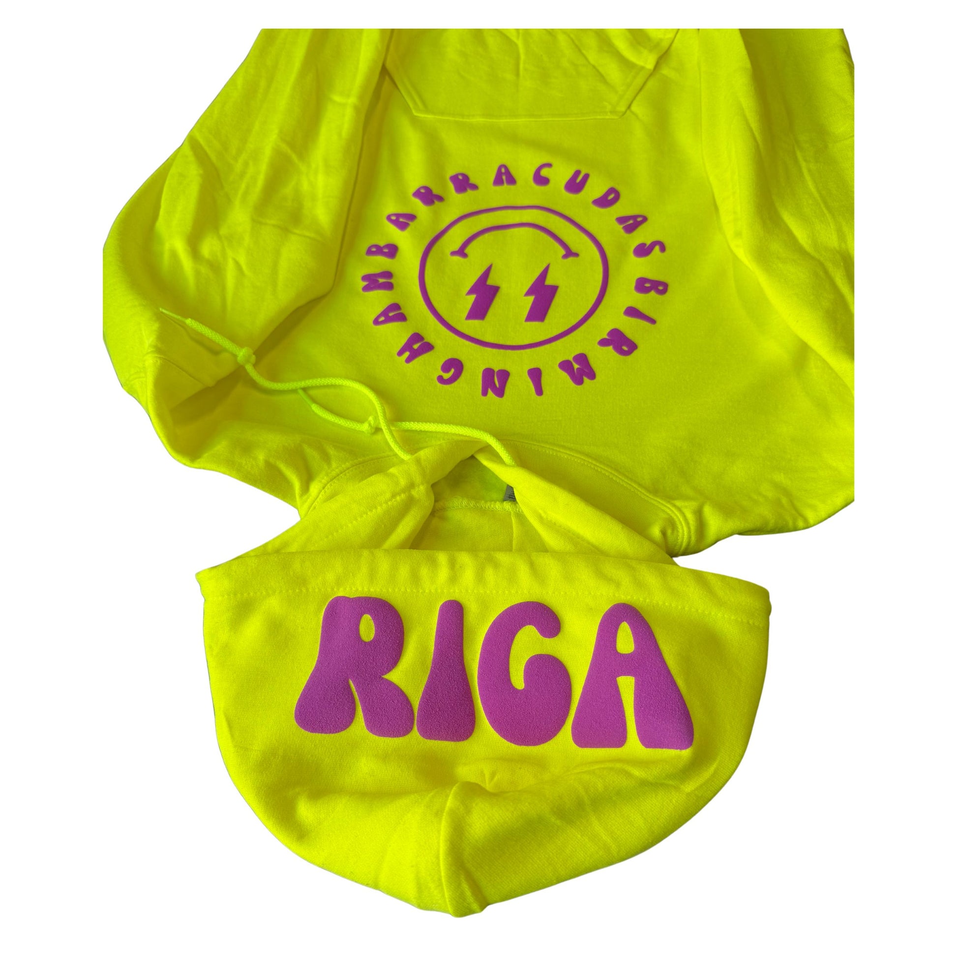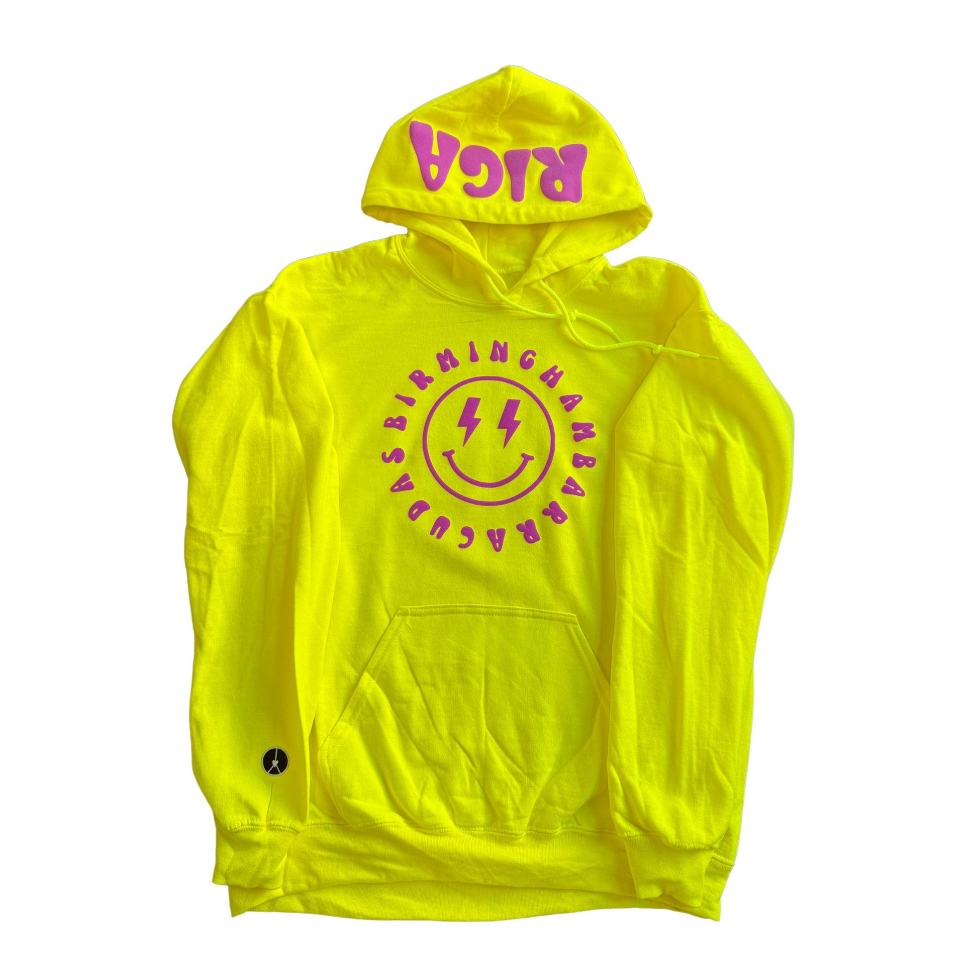 Neon yellow hoodie with Birmingham, barracuda smile, face with bolt eyes and puff, neon purple plus option to customize hood