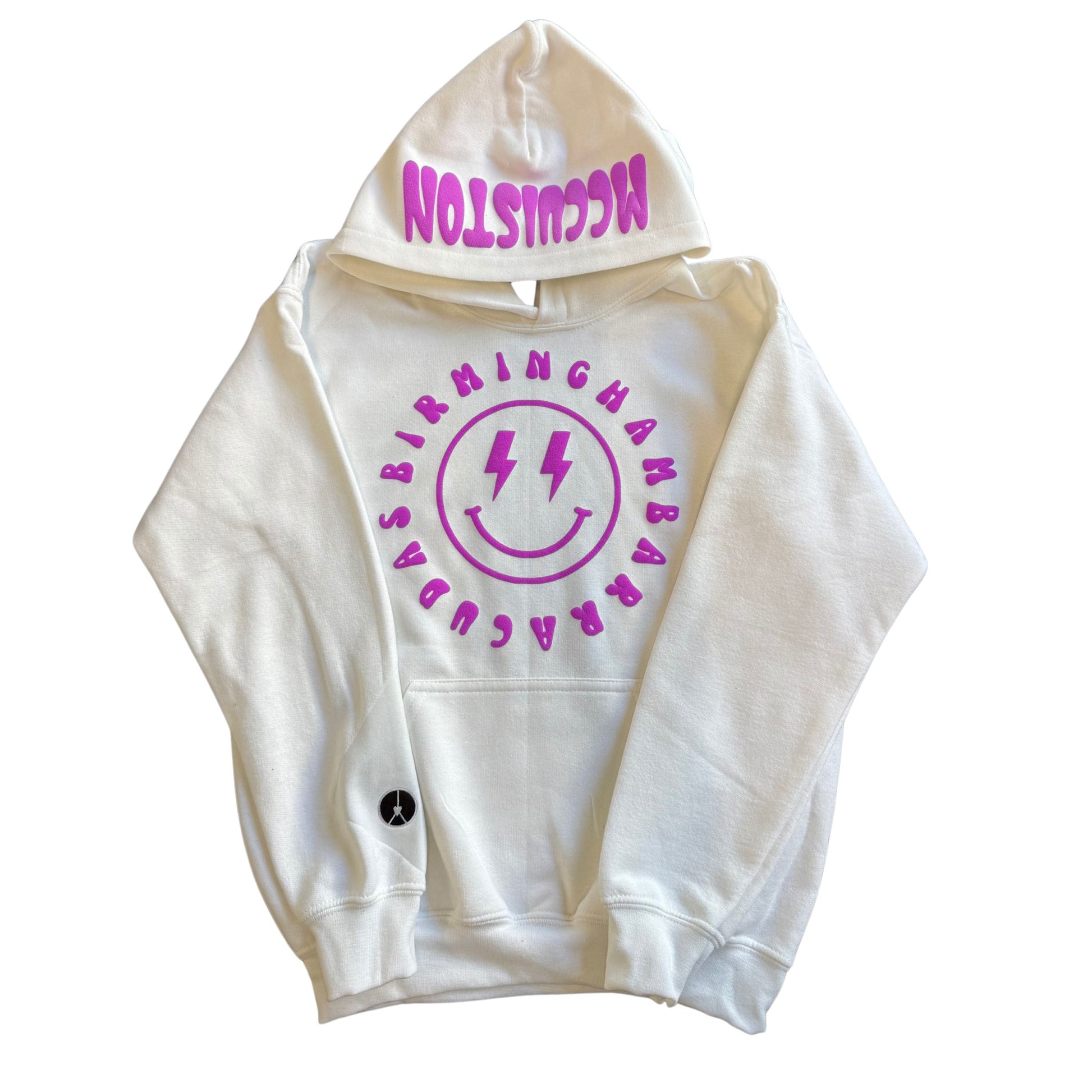 White hoodie with Birmingham barracuda smile, face with bolt eyes and puff neon purple plus option to customize hood