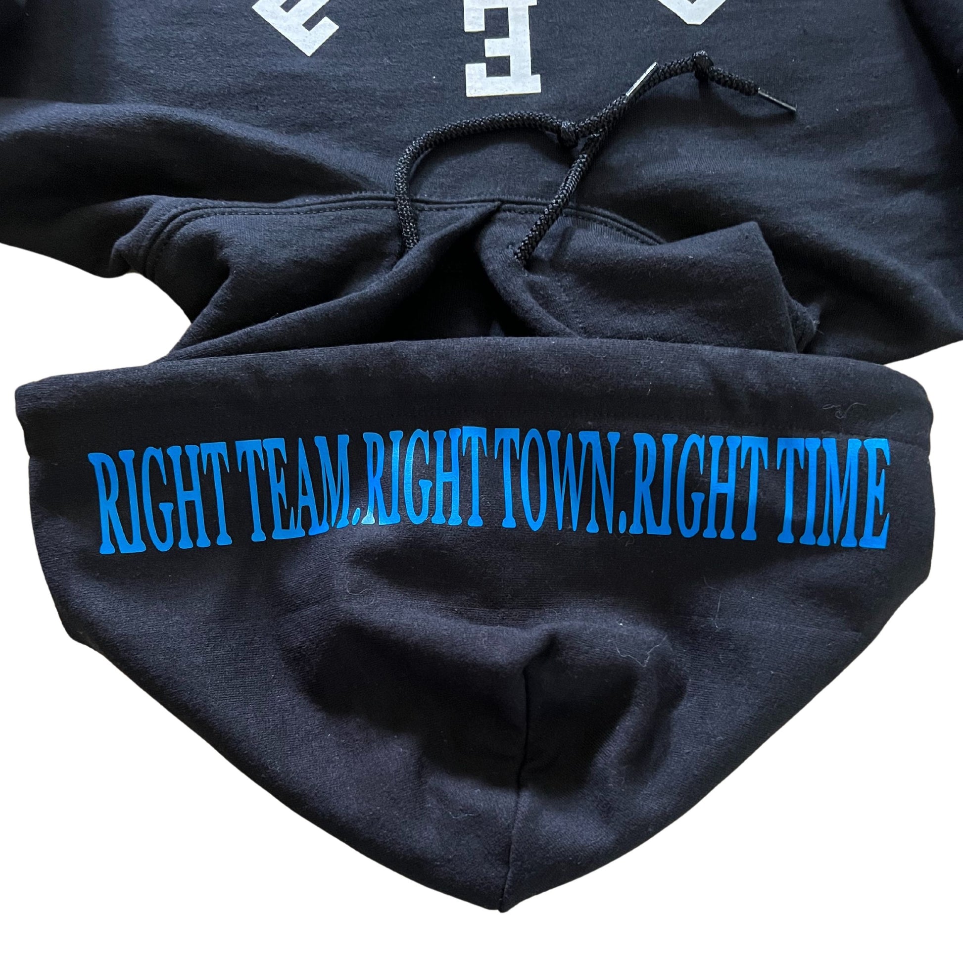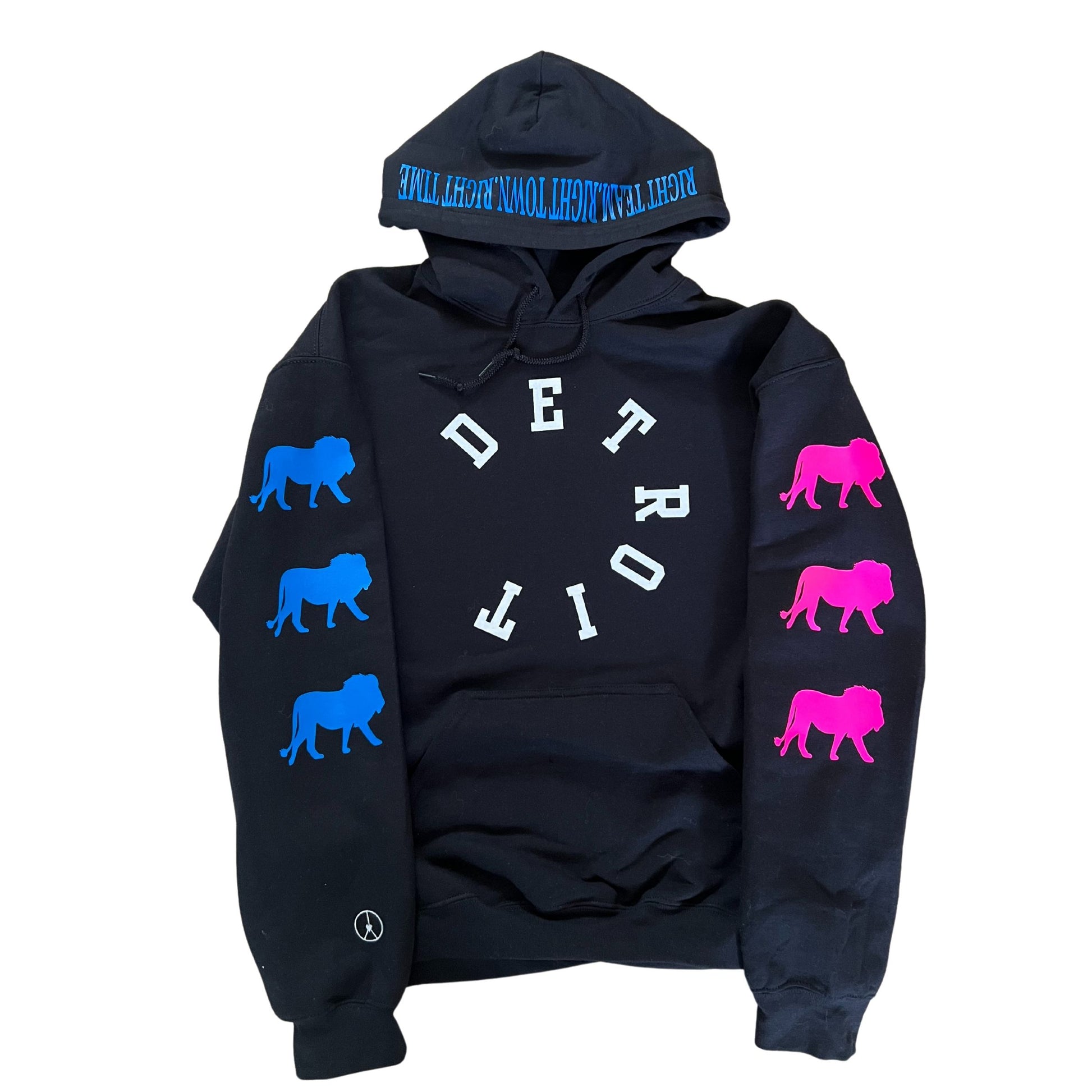 Black Detroit hoodie with pink and blue lions and hood reads right team, right town, right time