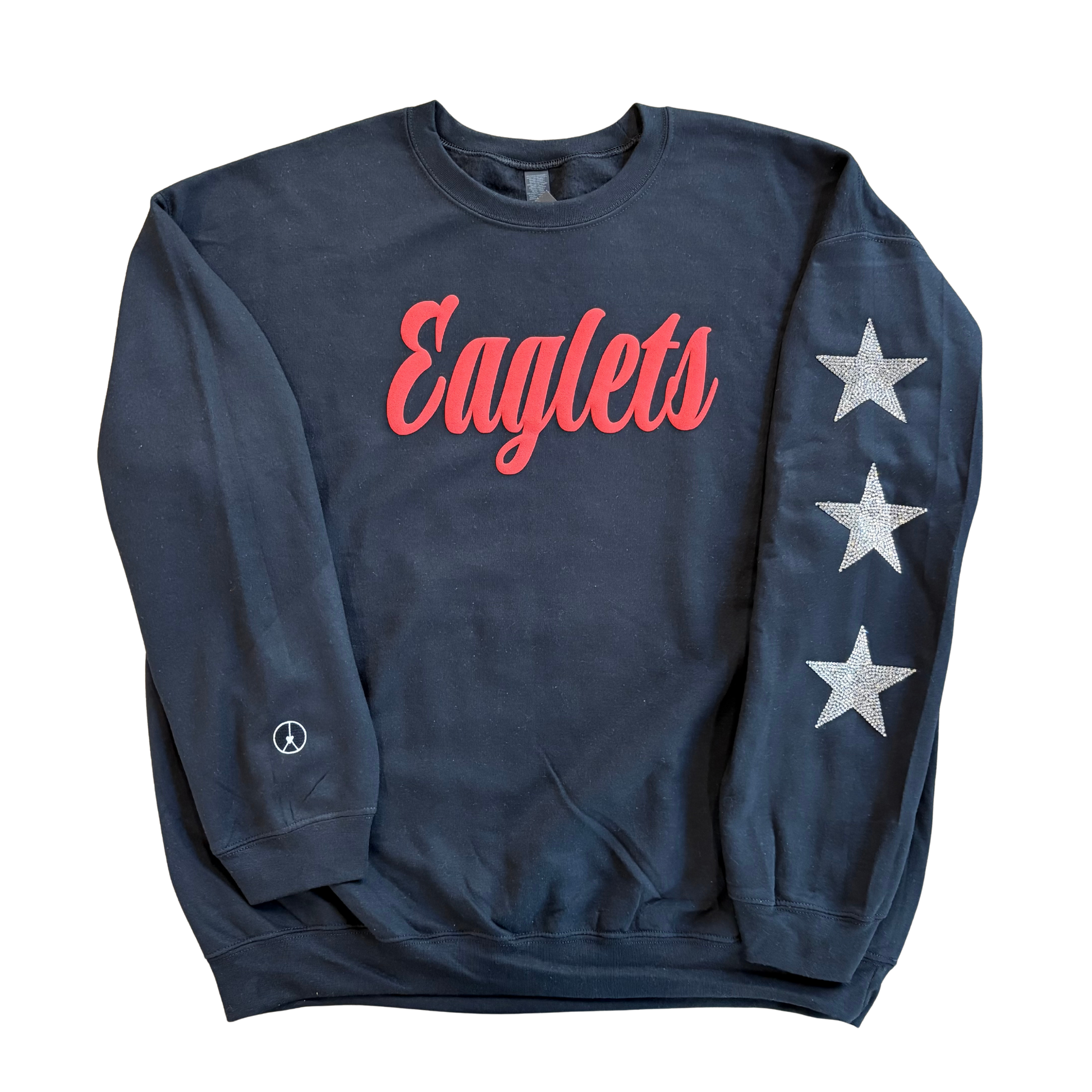 Black crewneck sweatshirt with Eaglets and red puff and two rhinestone stars on sleeve