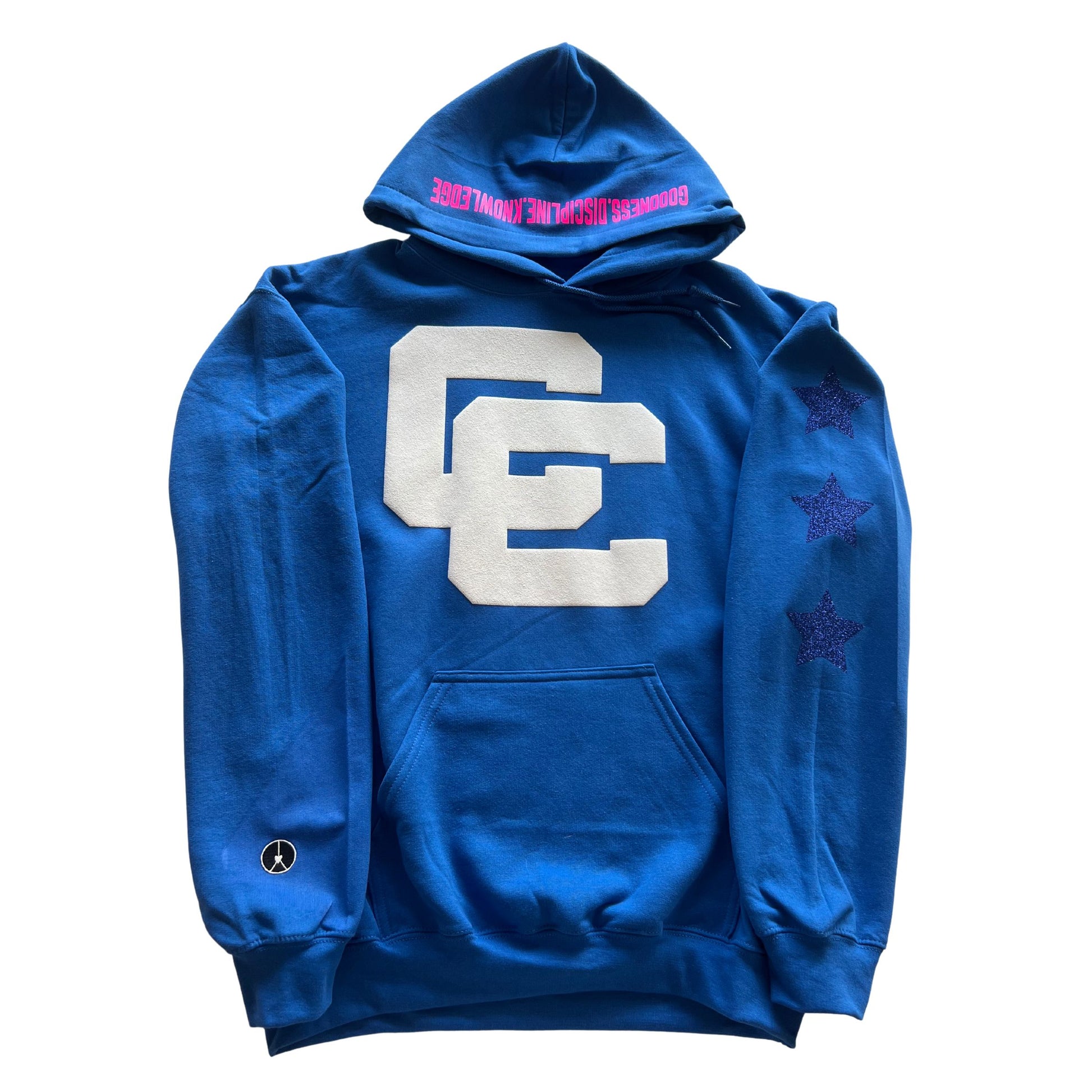 Blue hoodie with CC puff and blue Stars on sleeve with hood and back design