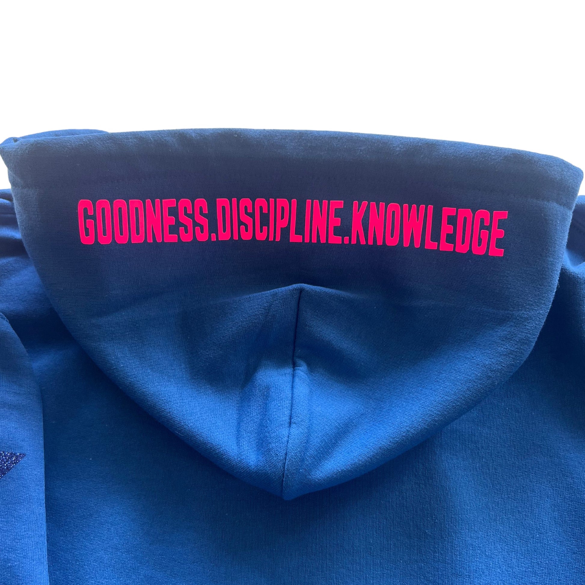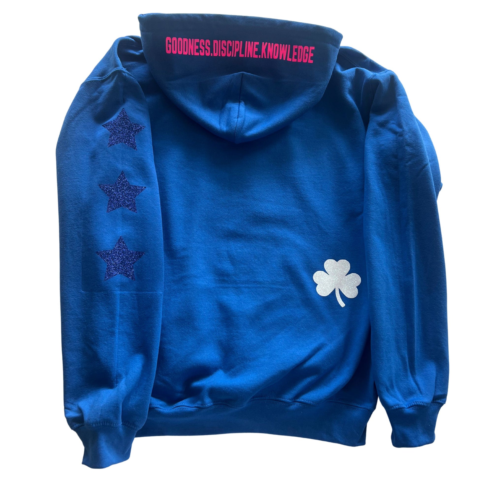 Blue hoodie with CC puff blue stars on sleeve, hood reads goodness.discipline.knowledge and shamrock on back