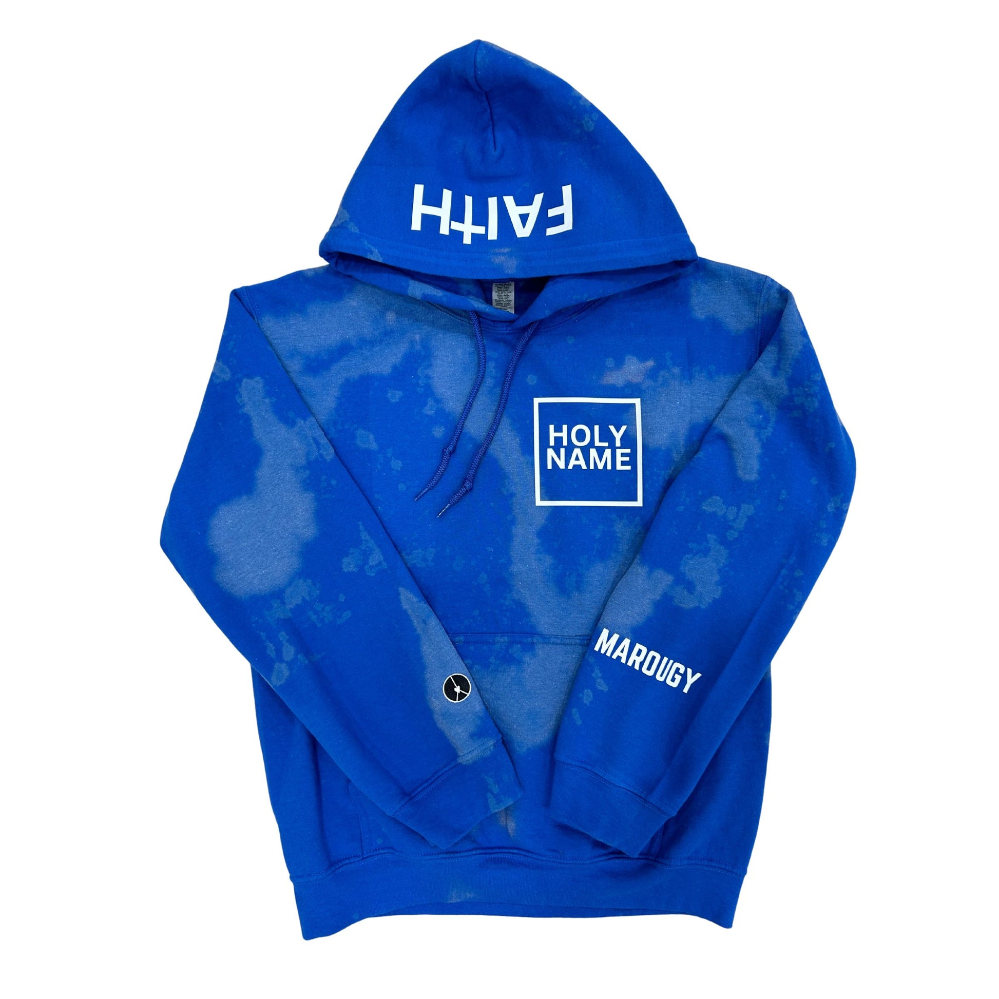 Blue tie die hoodie with white holy name in corner chest area, faith on hood and custom last name on sleeve