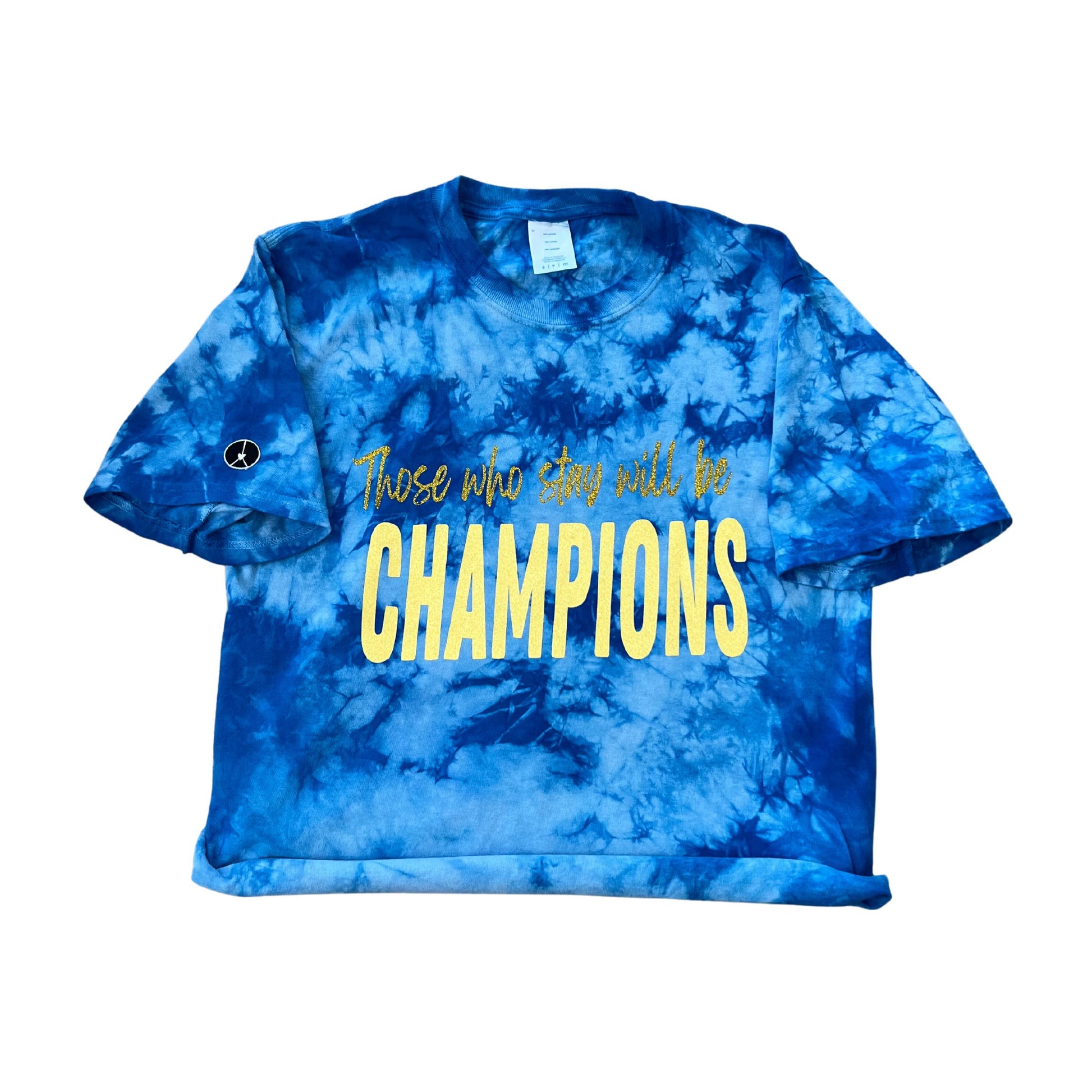 Blue tie-dye crewneck with those who stay will be champions in glitter
