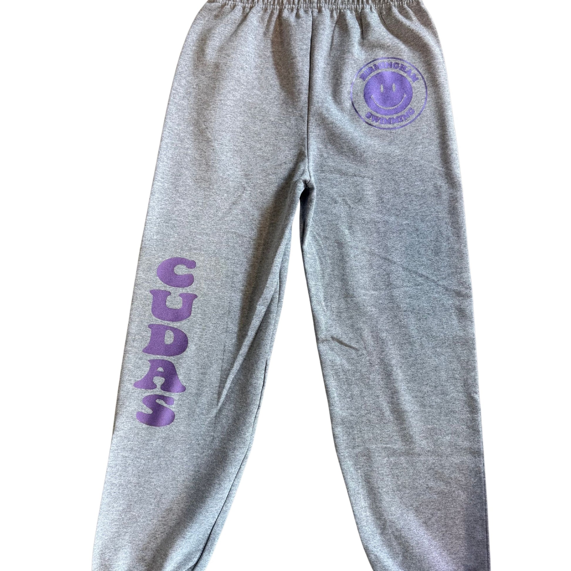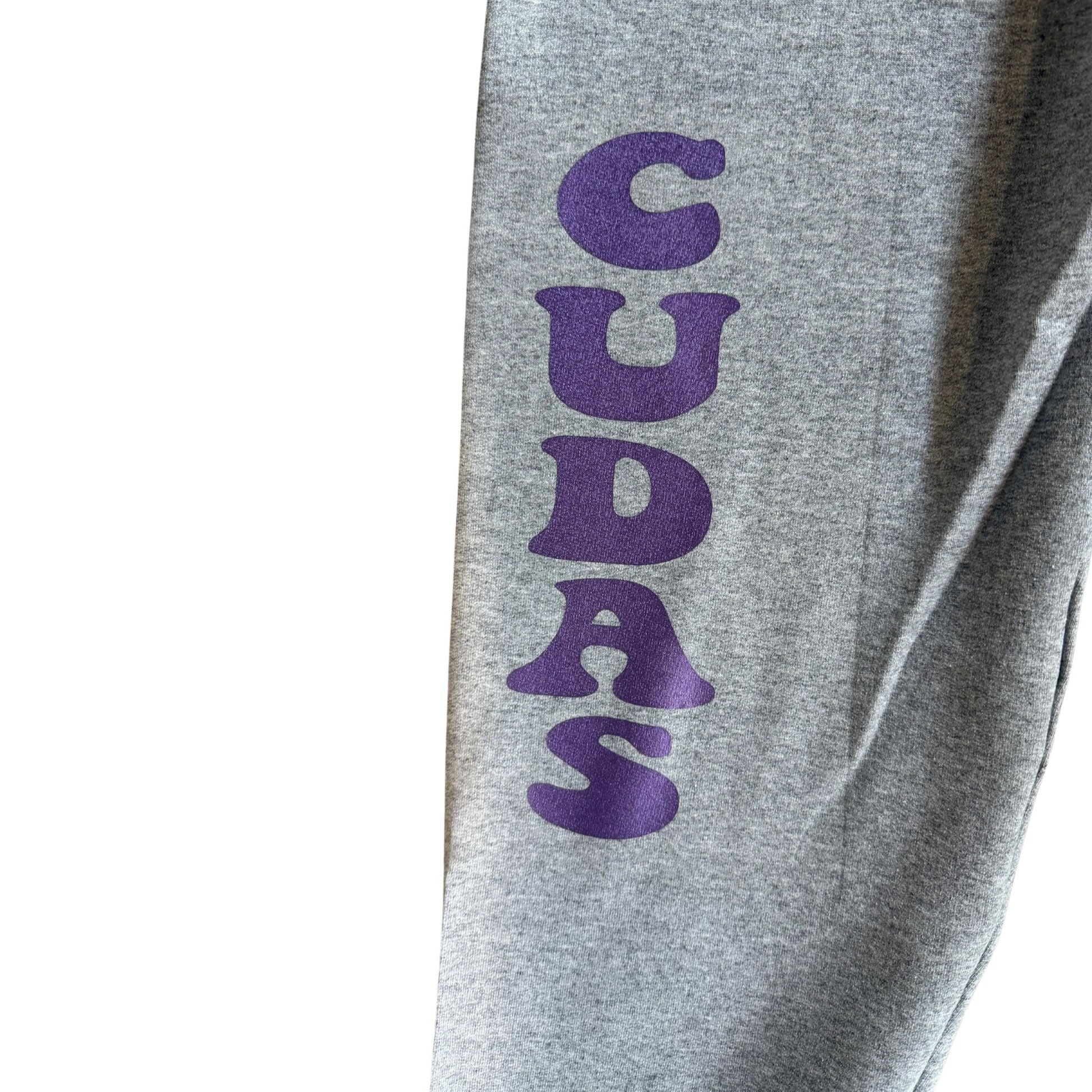 Gray old school jogger sweatpants with Cudas going down leg and Birmingham swimming in purple metallic