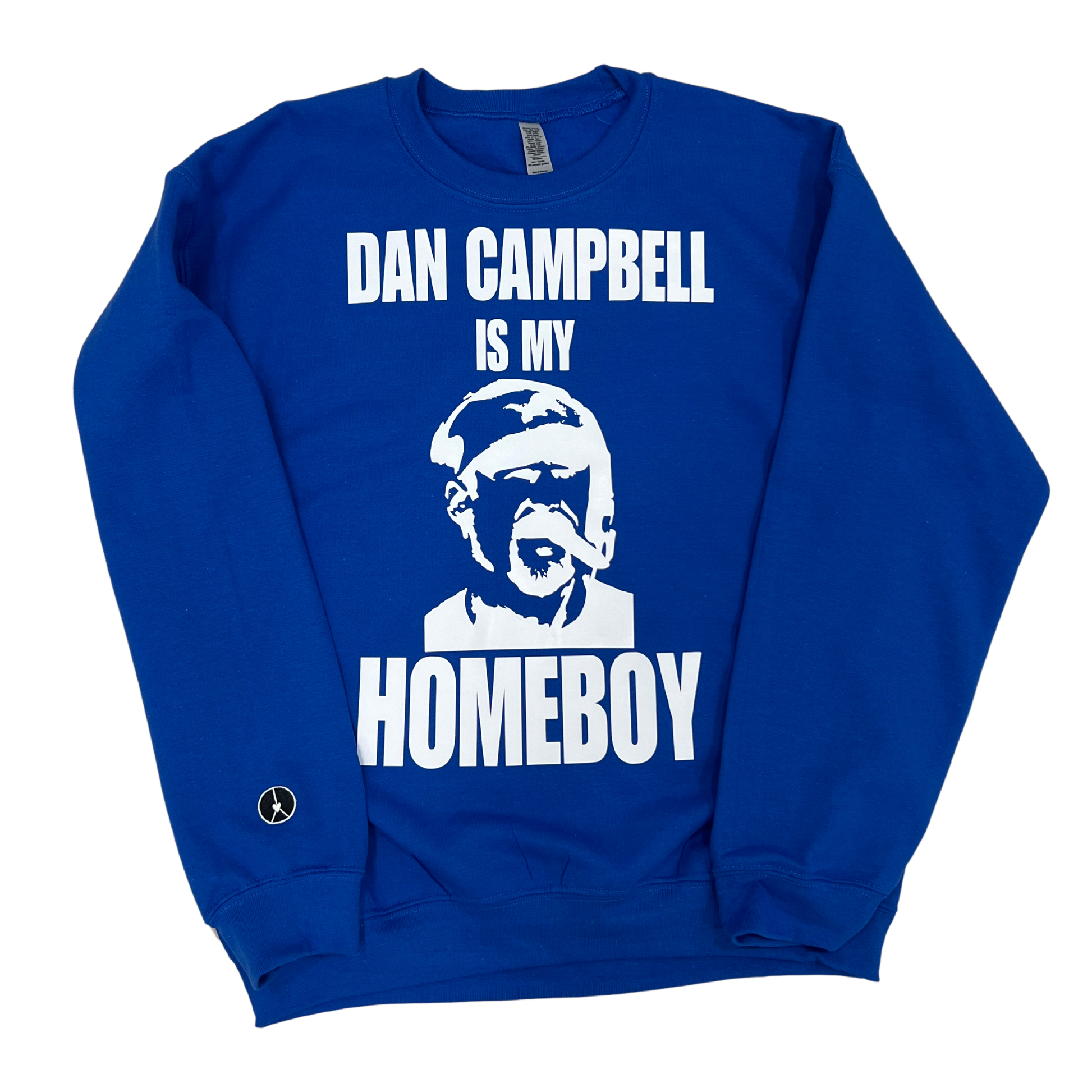 Royal blue crewneck with white graphic Dan Campbell is my homeboy in white.