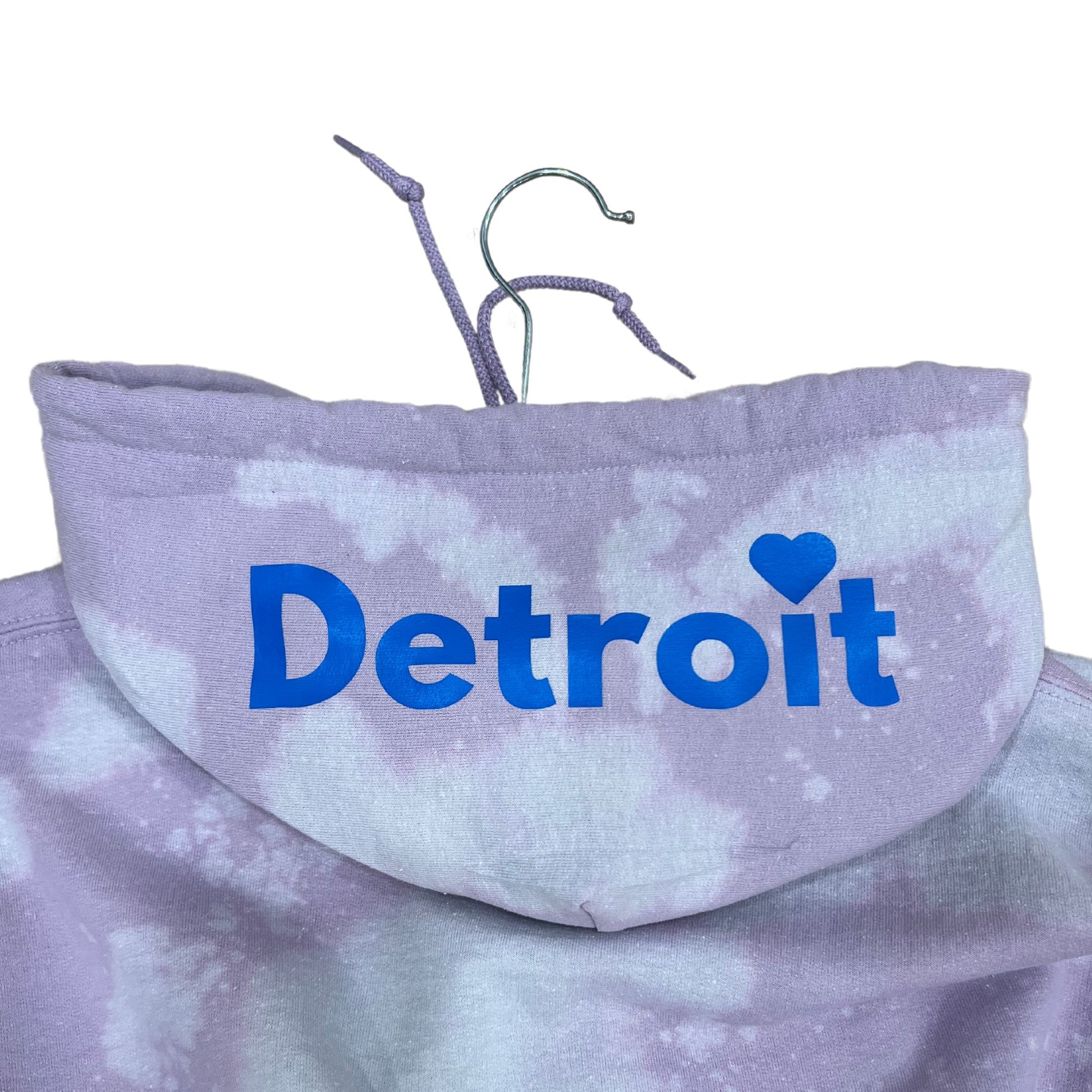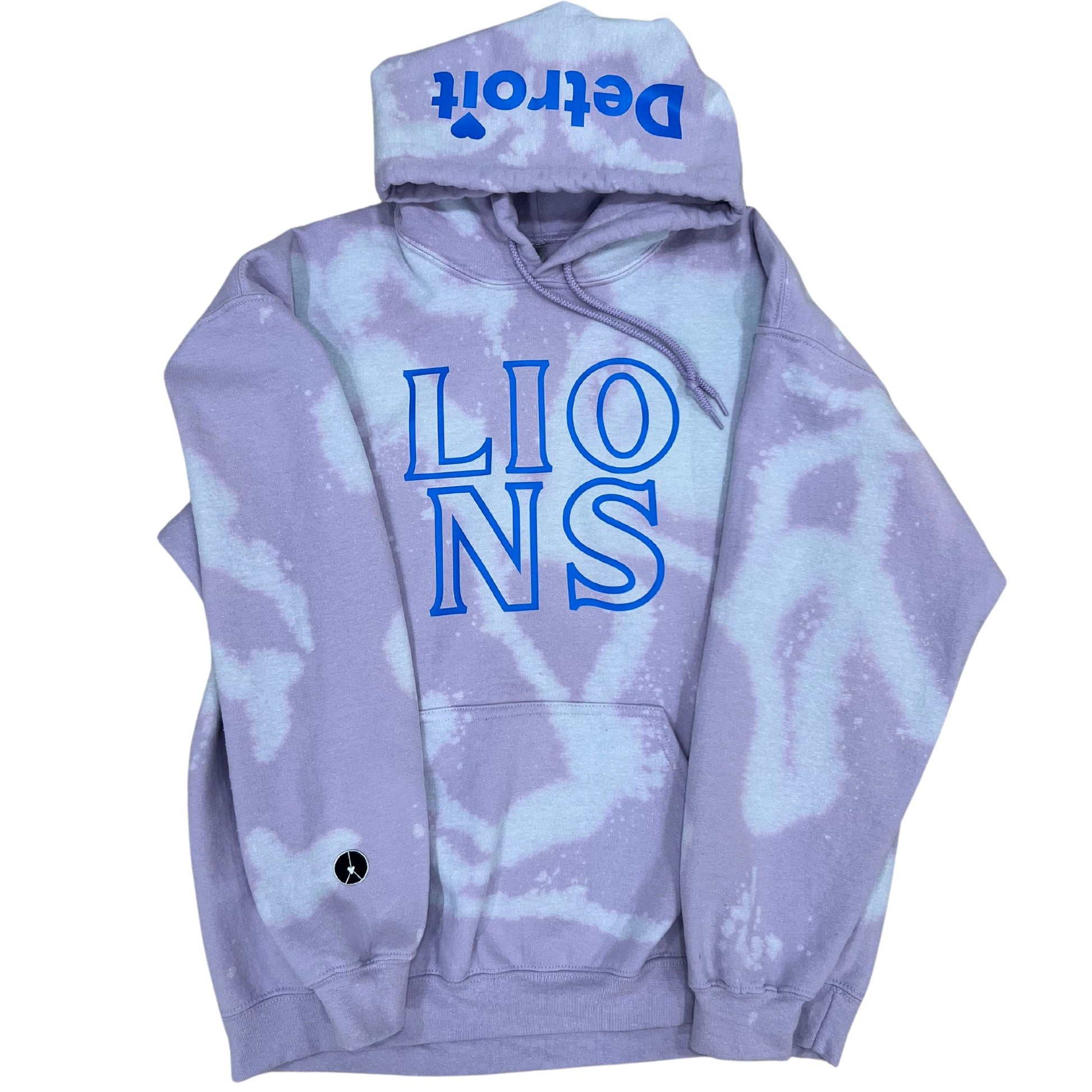Hand tie died lilac hoodie with blue Detroit on hood and large outline Lions on front.