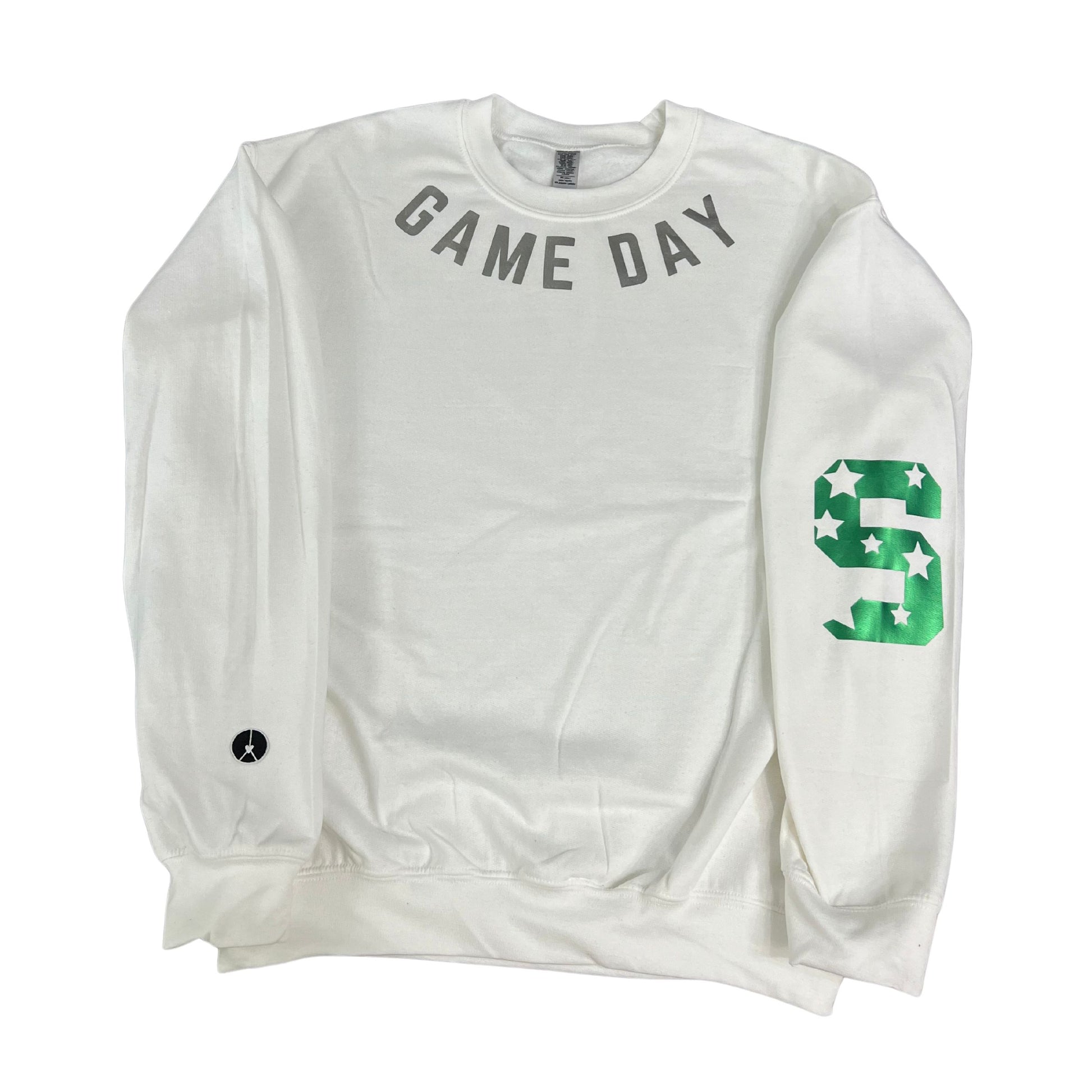 Game day, white crewneck with silver and metallic green star S