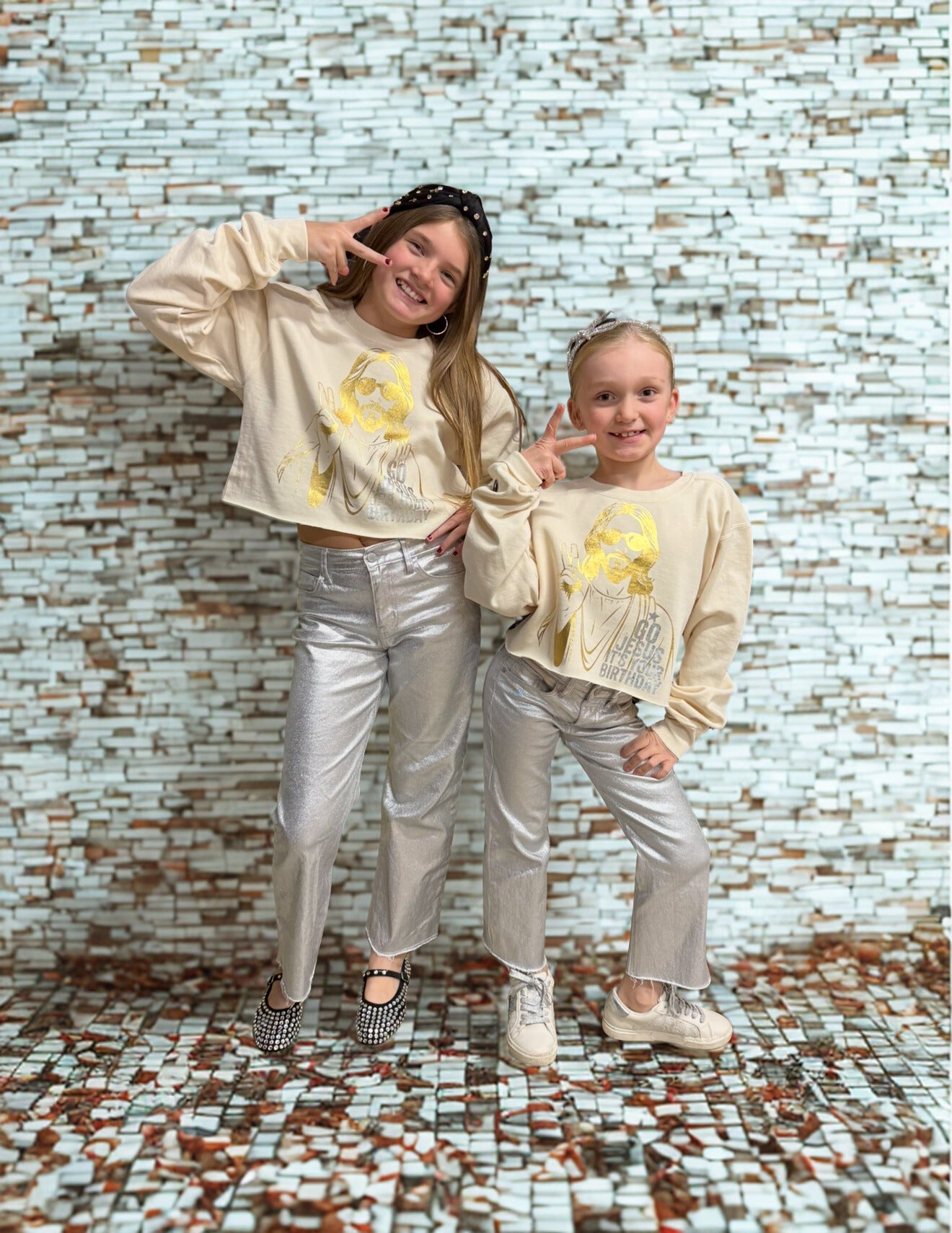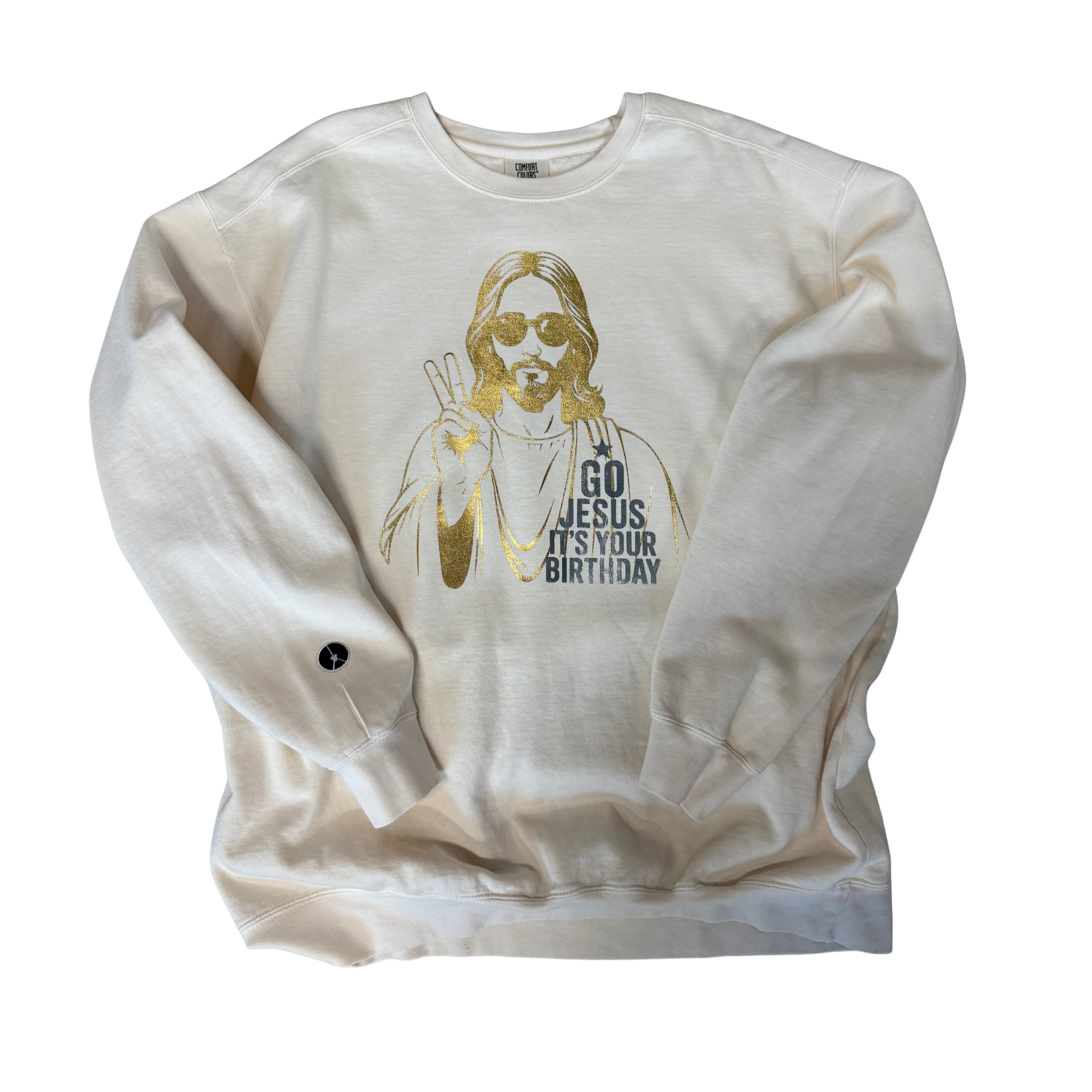 Ivory crewneck with Jesus, silhouette in gold foil and go Jesus it's your birthday and silver foil, rhinestone cross on the back