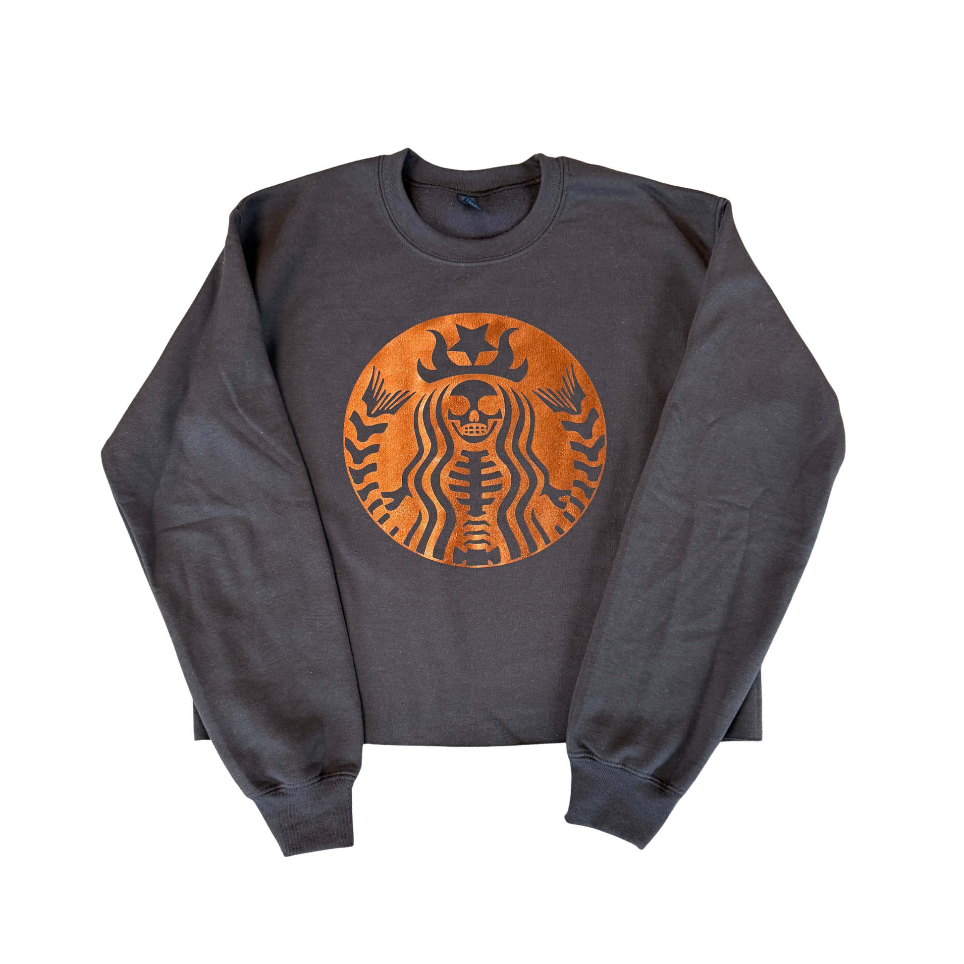 Brown crewneck crop with Halloween Starbucks in copper metallic