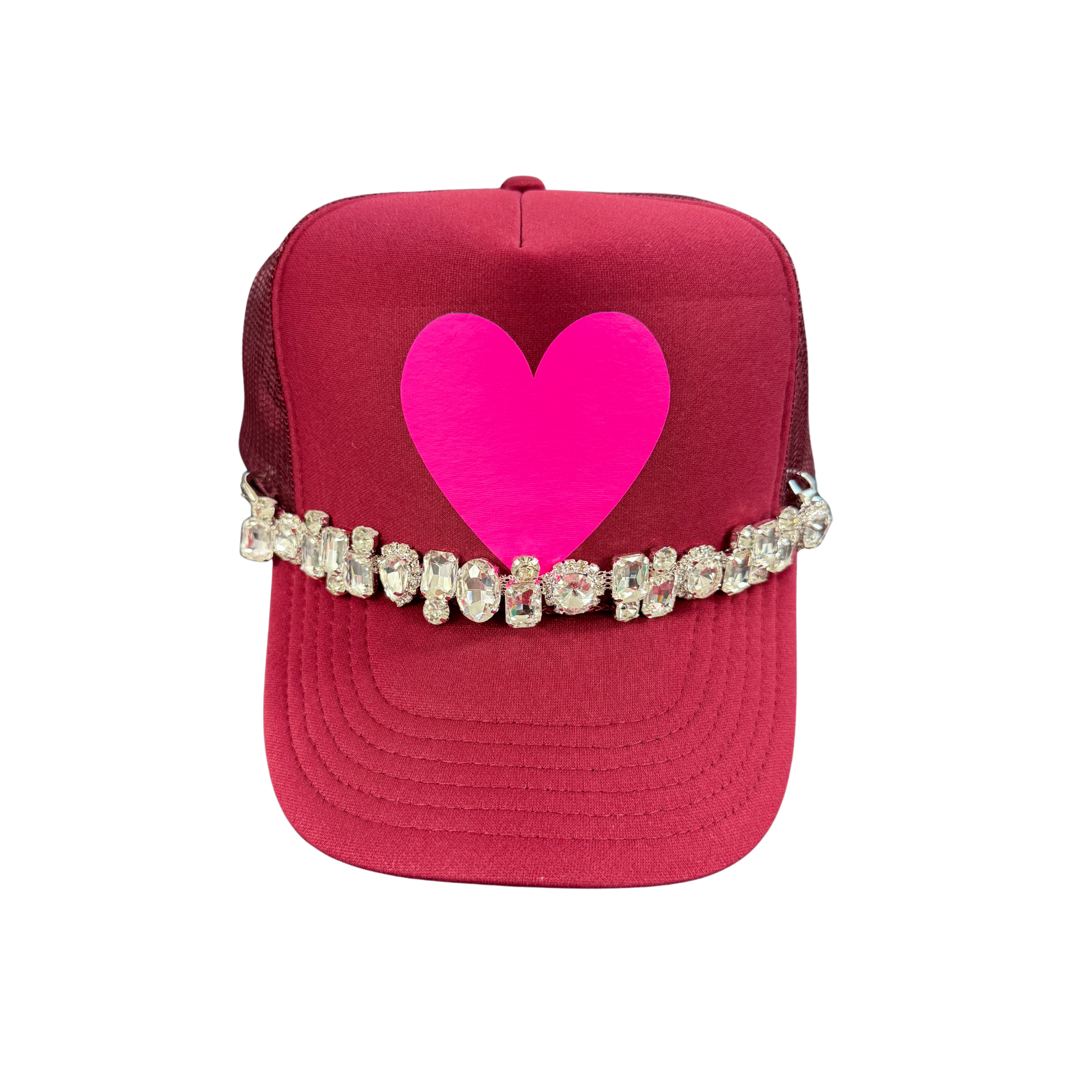 Garnet trucker hat with neon pink heart and jumbo Rhinestone Chain