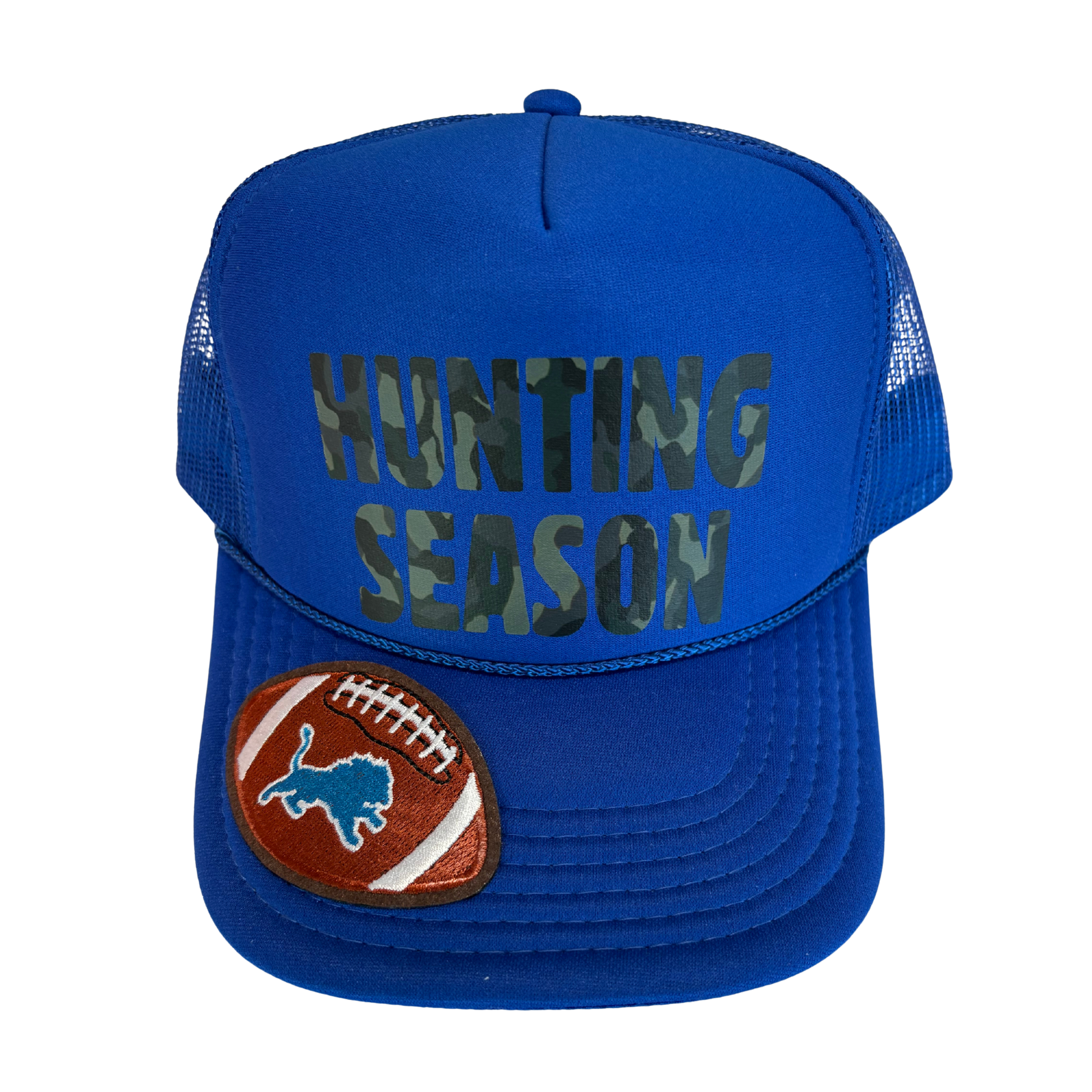 Royal blue Trucker hat with hunting season and camo print and football patch