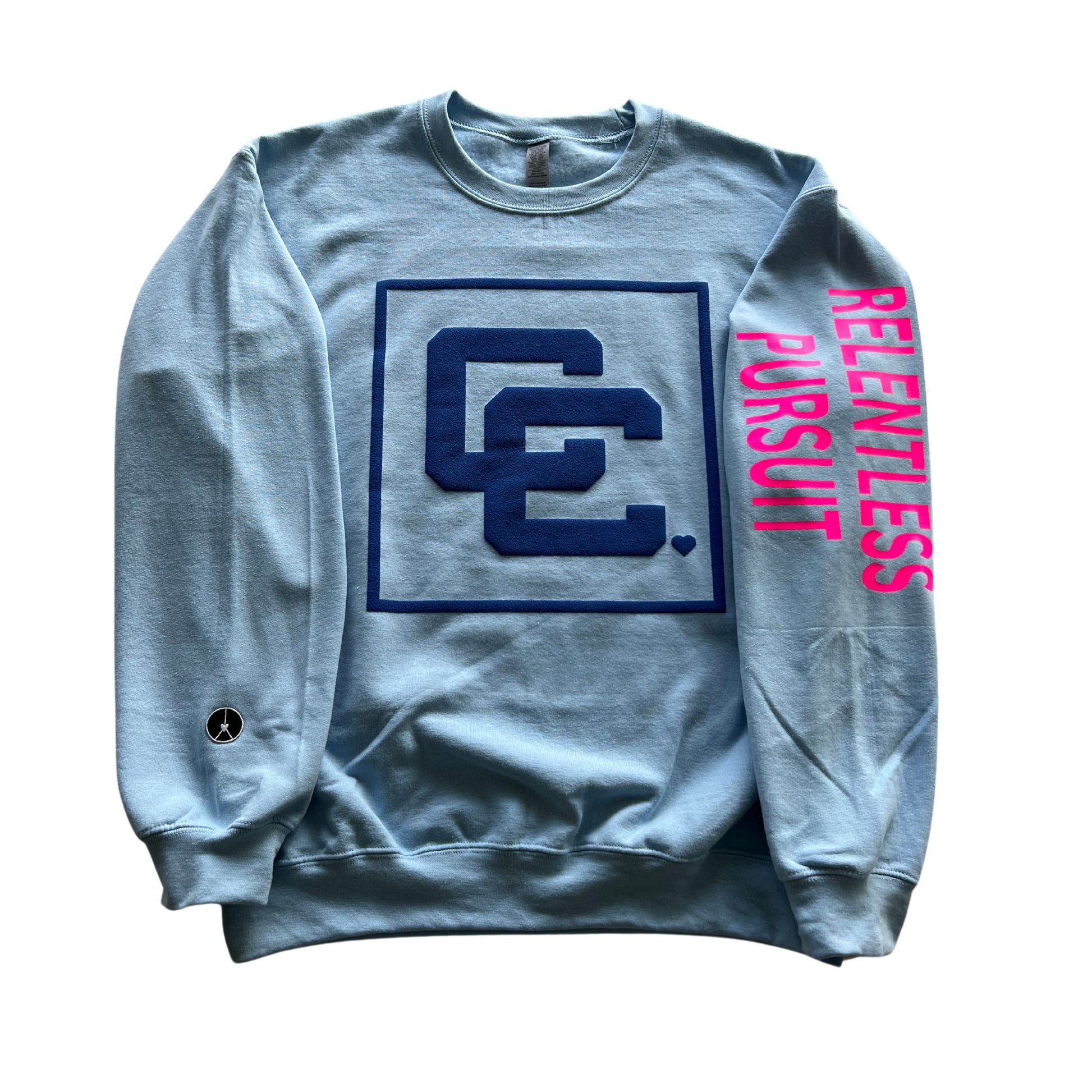 Light blue crewneck sweatshirt with puff blue, cc, and relentless pursuit and neon pink on sleeve