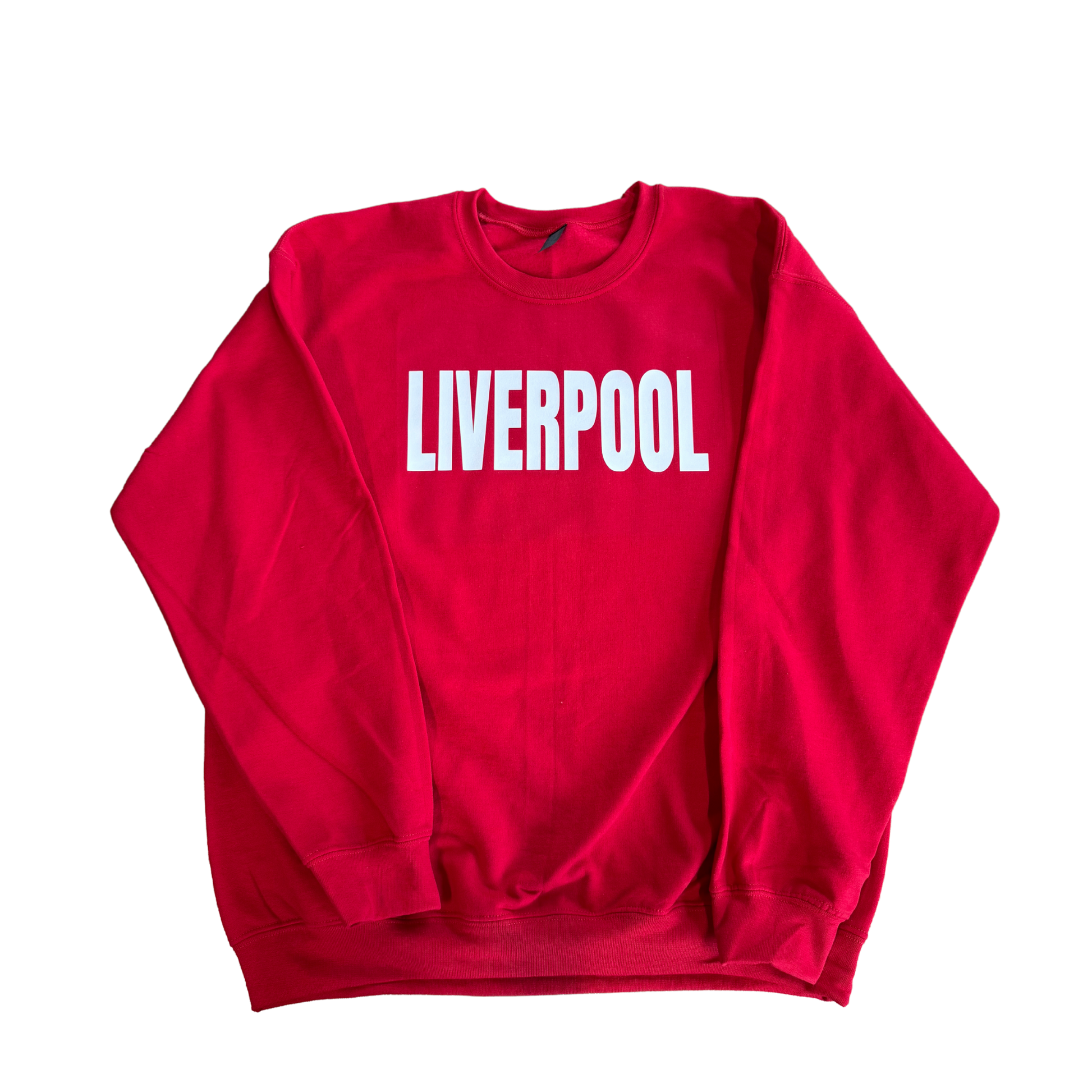 Red crewneck with Liverpool and white and option for customizable heart sleeve