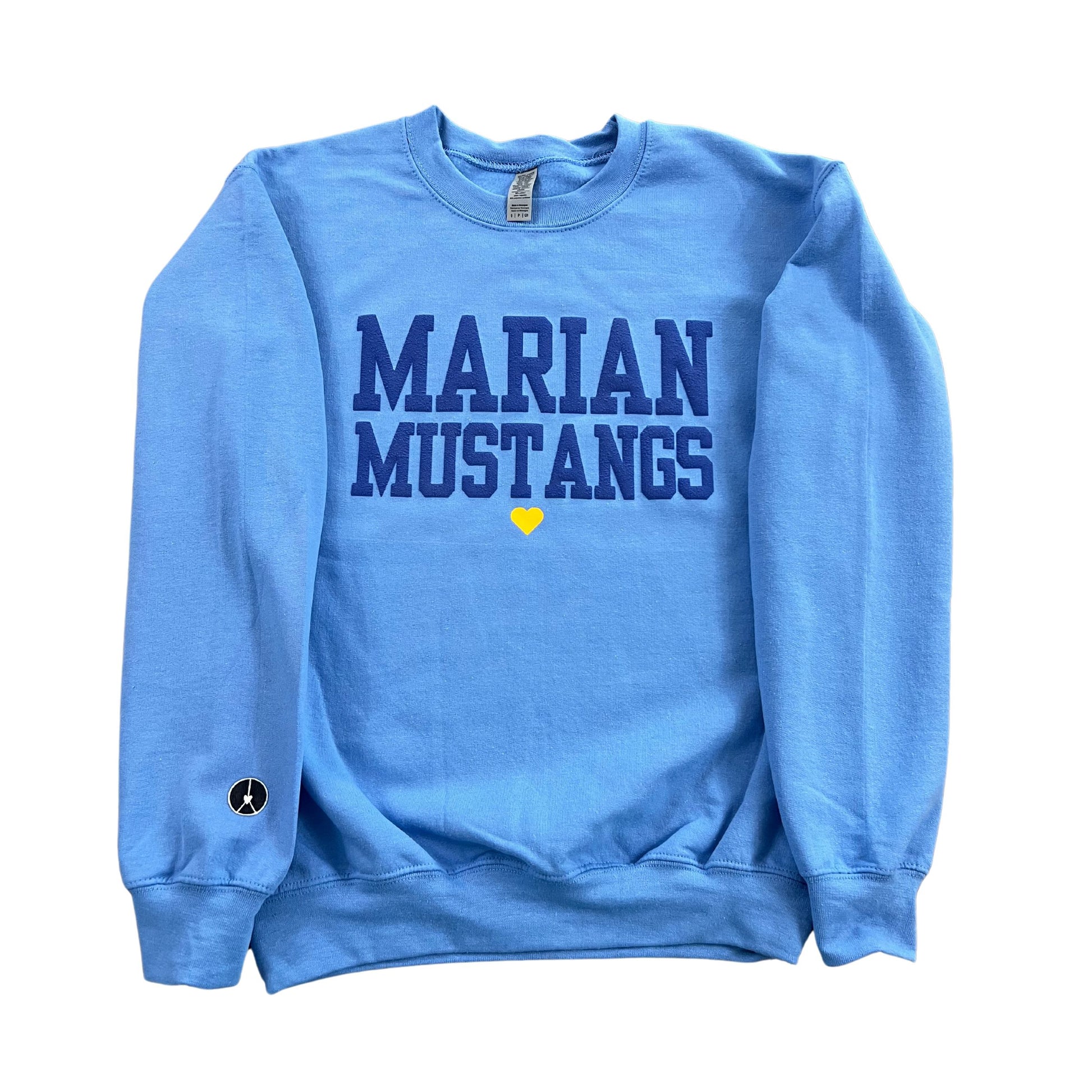 Cornflower blue crewneck sweatshirt with blue Marian, Mustangs, and puff and yellow heart