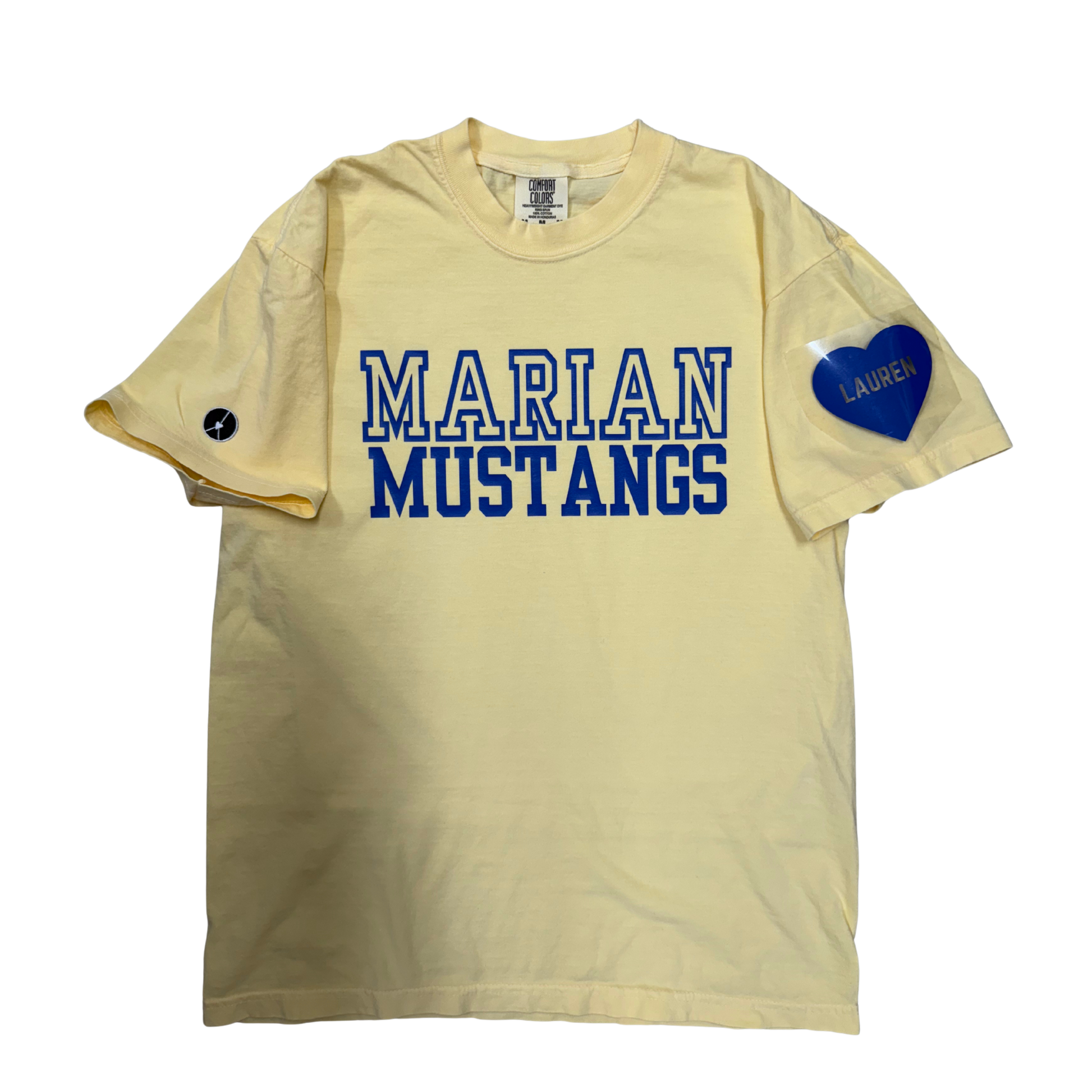 Butter, yellow T-shirt with Marion Mustangs in Royal blue and option to customize heart sleeve