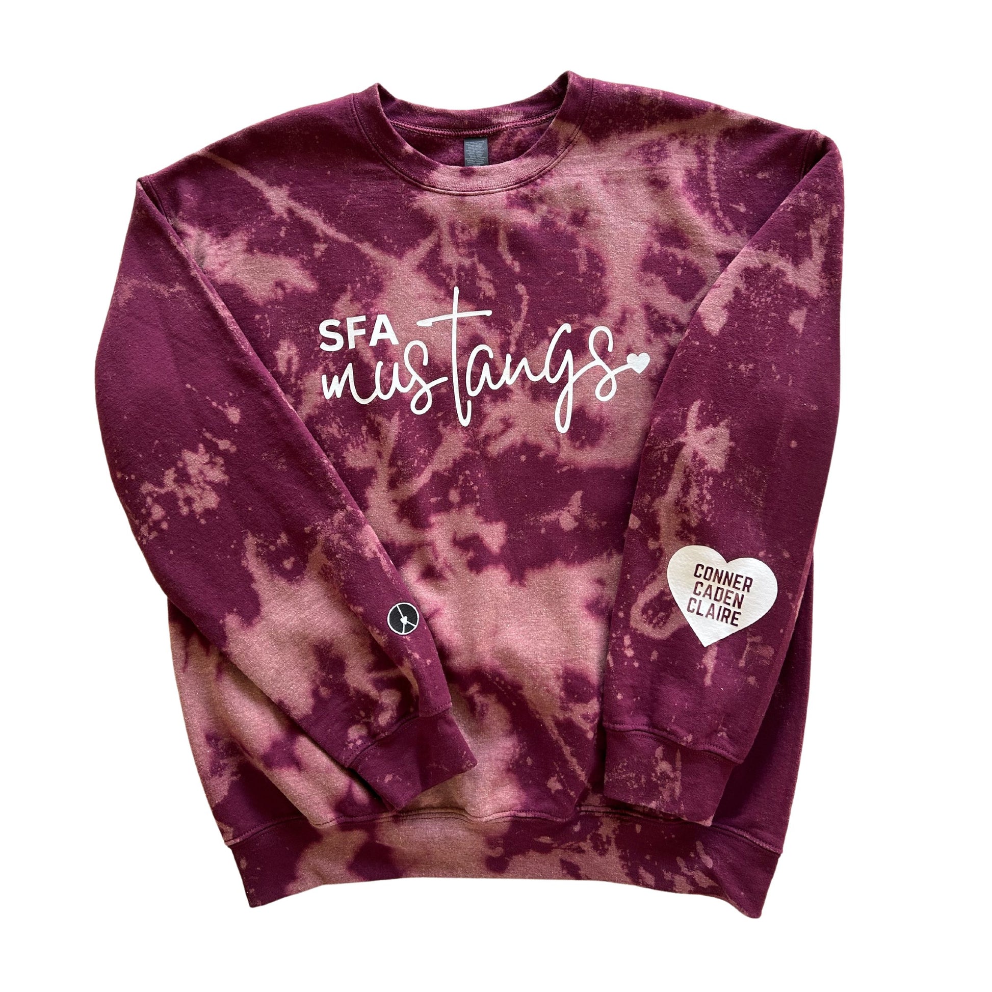 Sangria tie-dye crewneck sweatshirt with SFA mustangs and customized sleeve