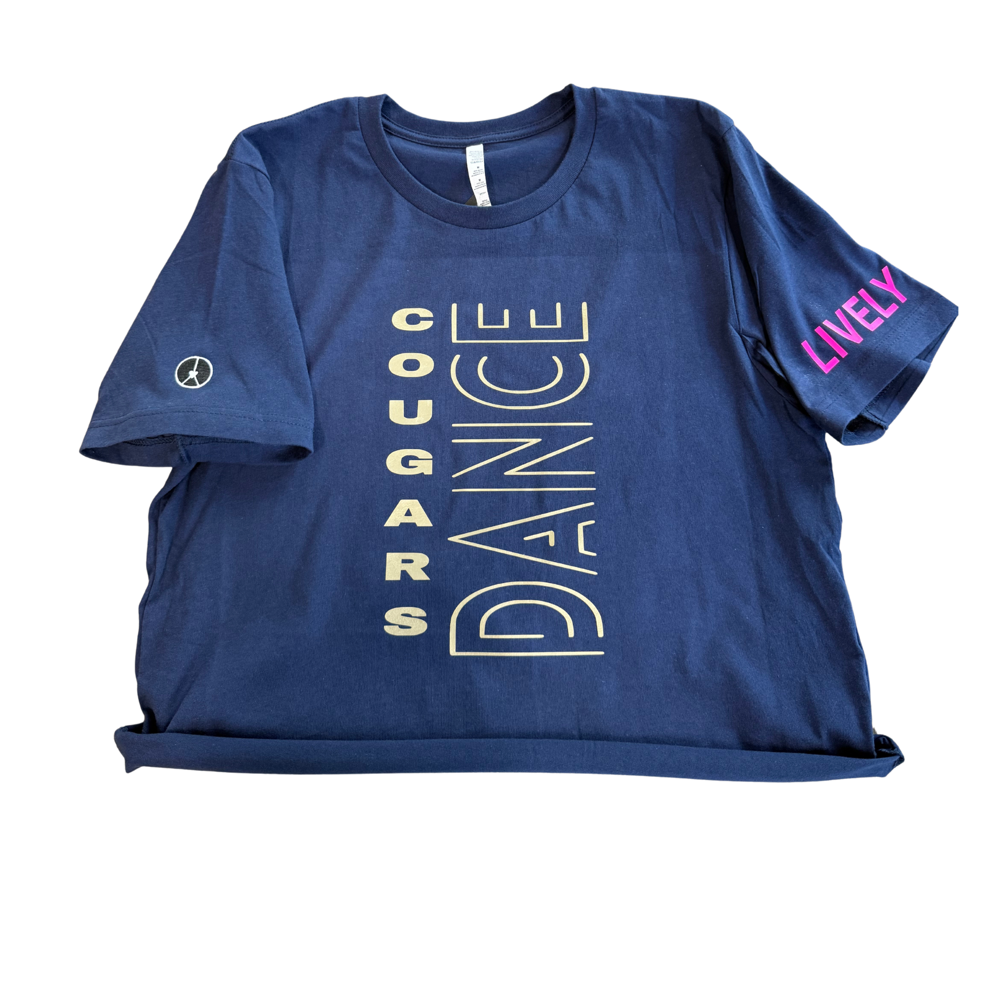 Navy crewneck T-shirt crop with gold, cougars, dance, and option for customizable sleeve in pink