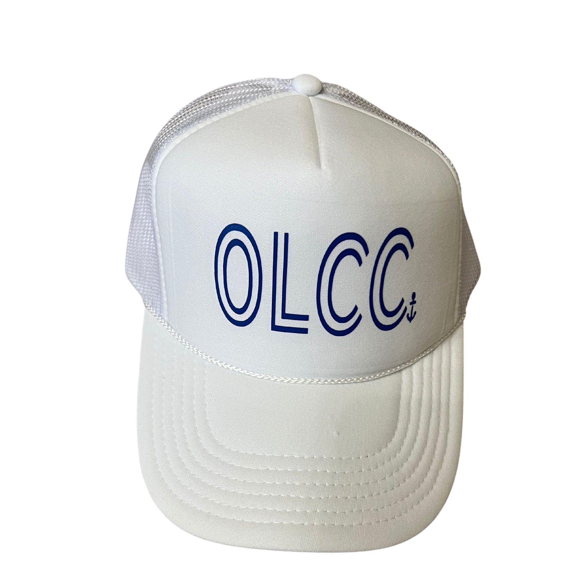 White trucker hat with blue double line OLCC and anchor.
