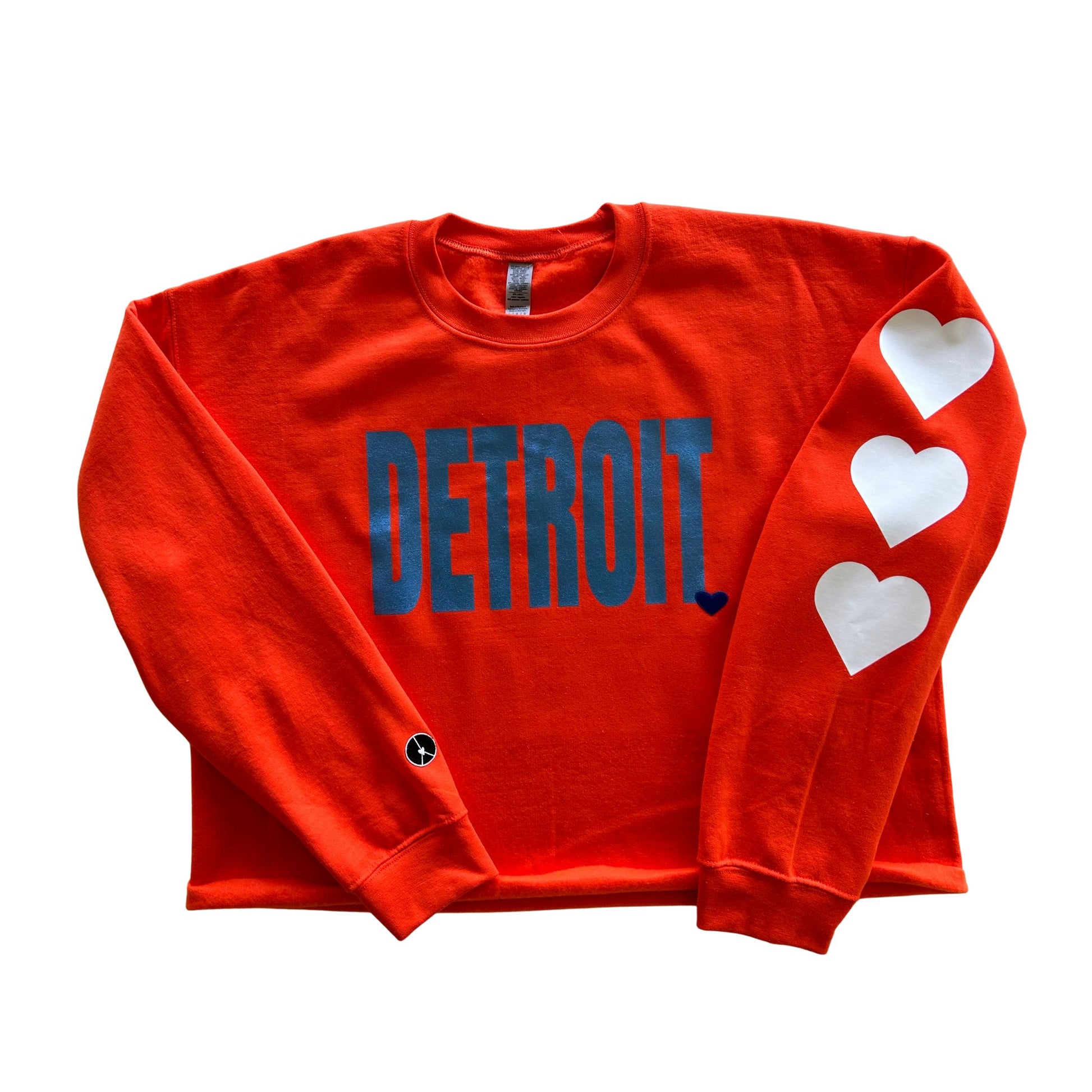 Orange crewneck crop with blue metallic Detroit and white hearts on sleeve
