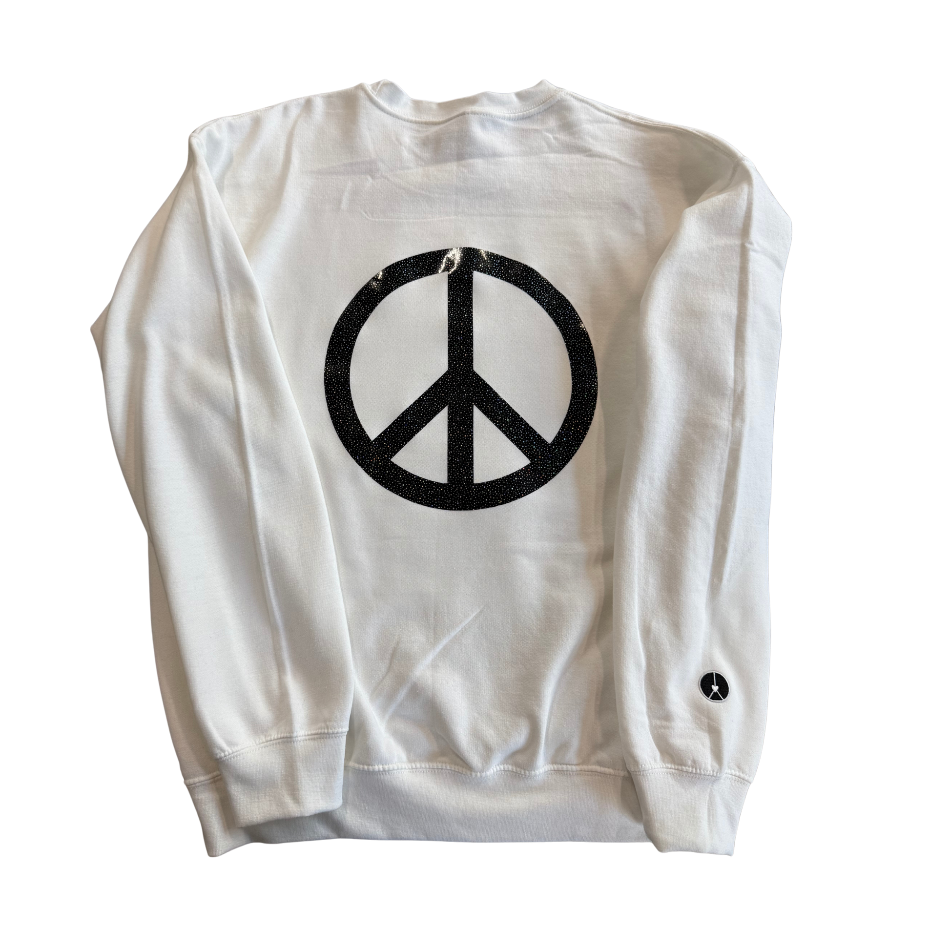 White crewneck with pray for snow in black speckled and Peace sign on back