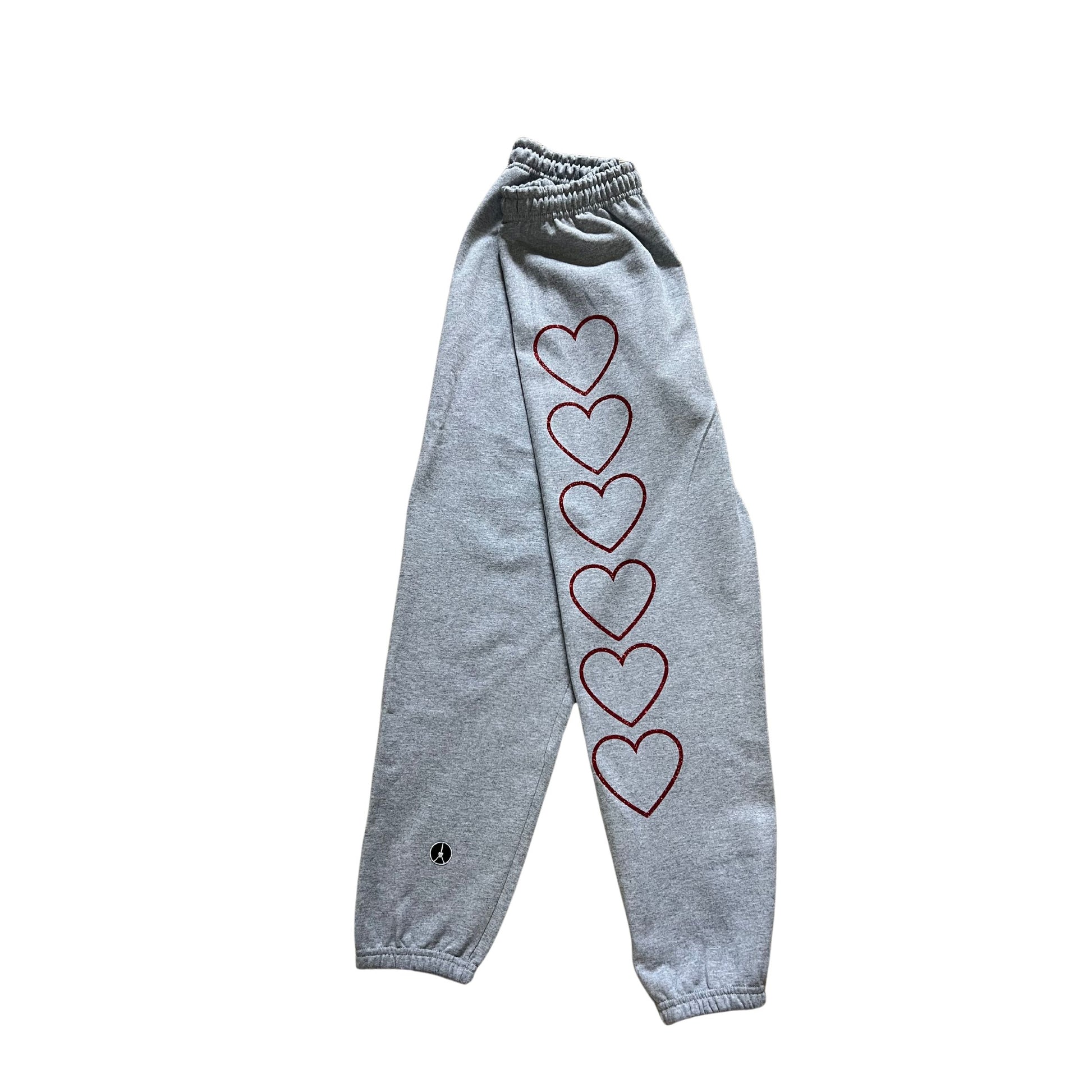 Gray old-school jogger sweatpants with red glitter hearts going down right leg
