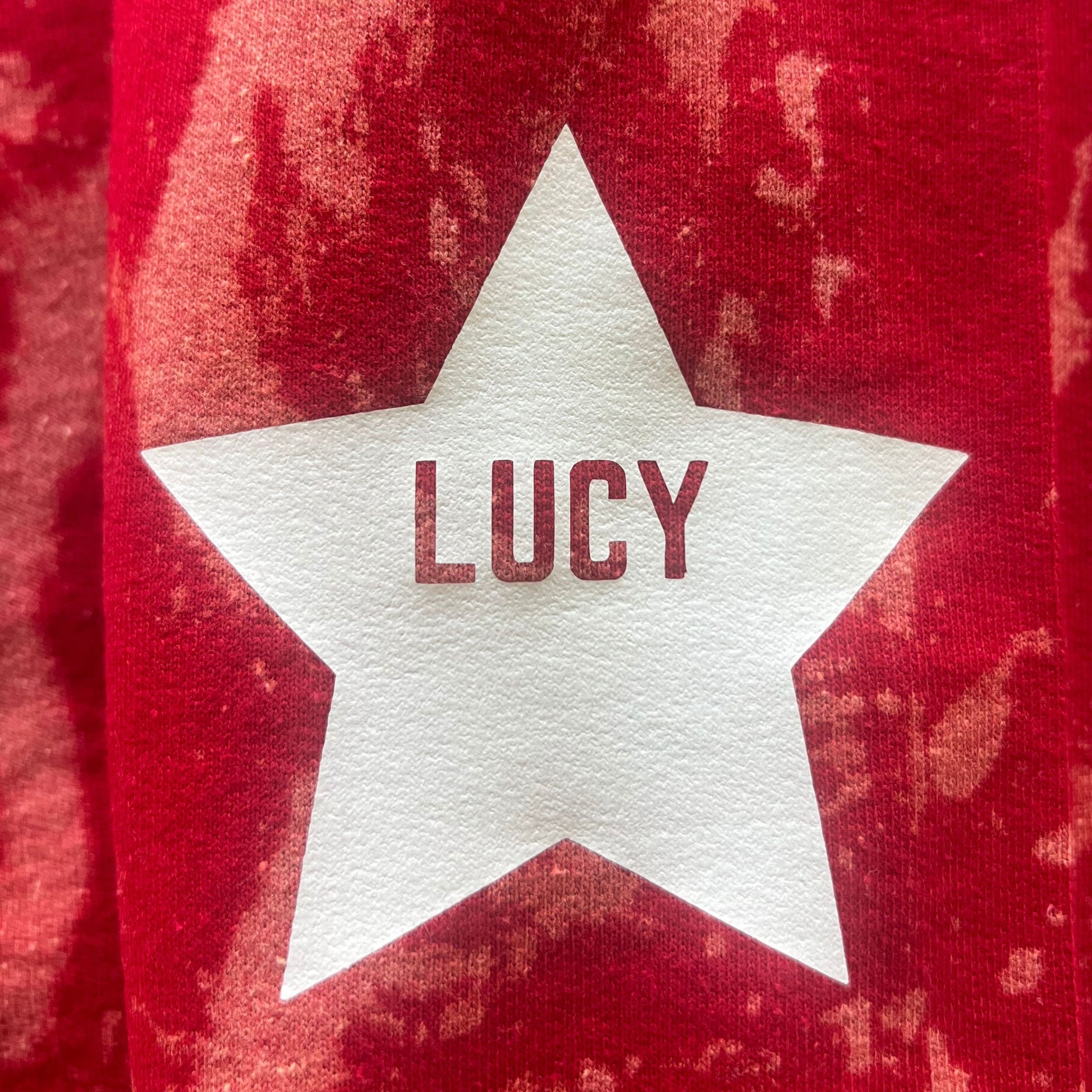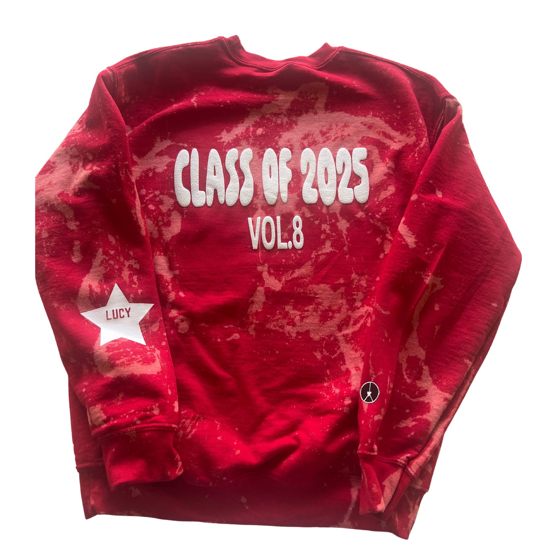 Red tie-dye crewneck derby, Swim and white puff with class of 2025 volume eight and puff on the back and customize Star on sleeve