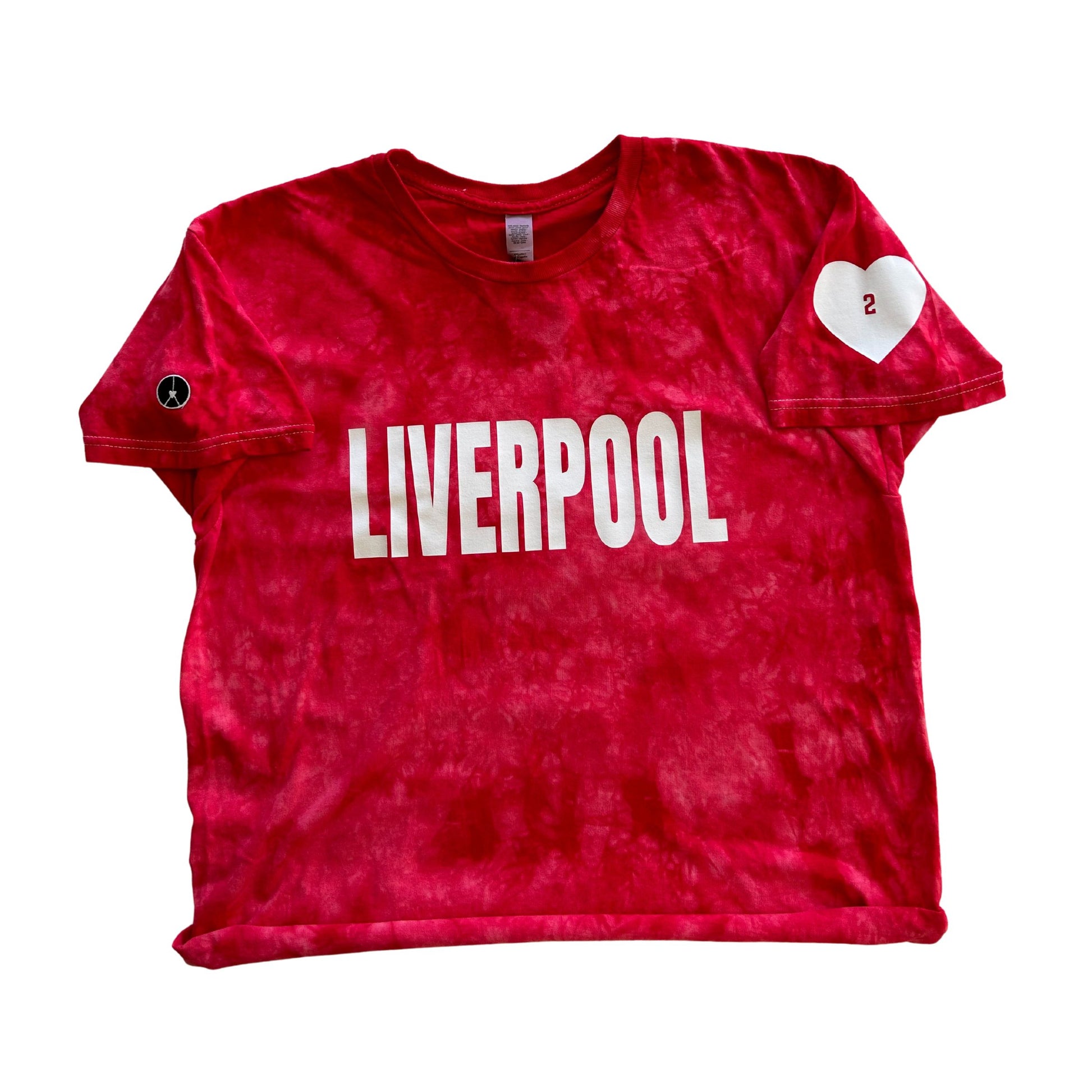 Red tie-dye crewneck with white Liverpool and option for custom heart and custom back