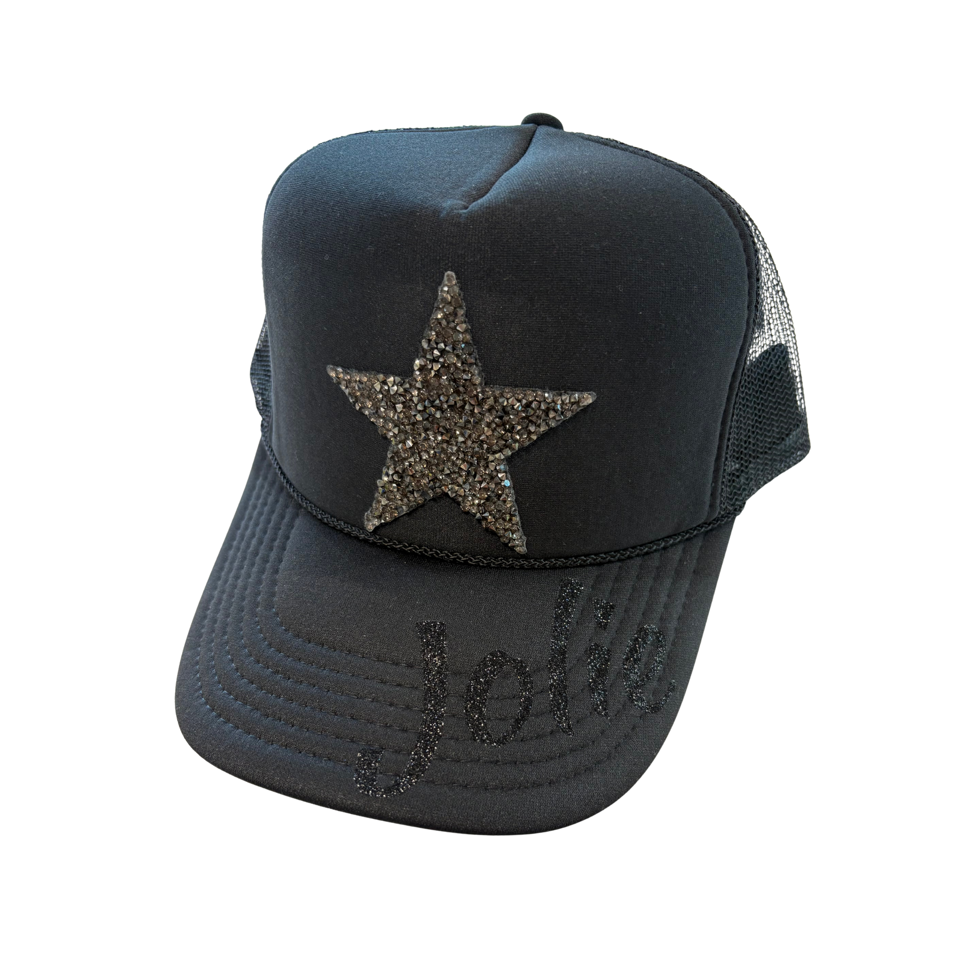 Black Trucker hat with slate gray rhinestone star, patch, and option to customize name on brim of Hat