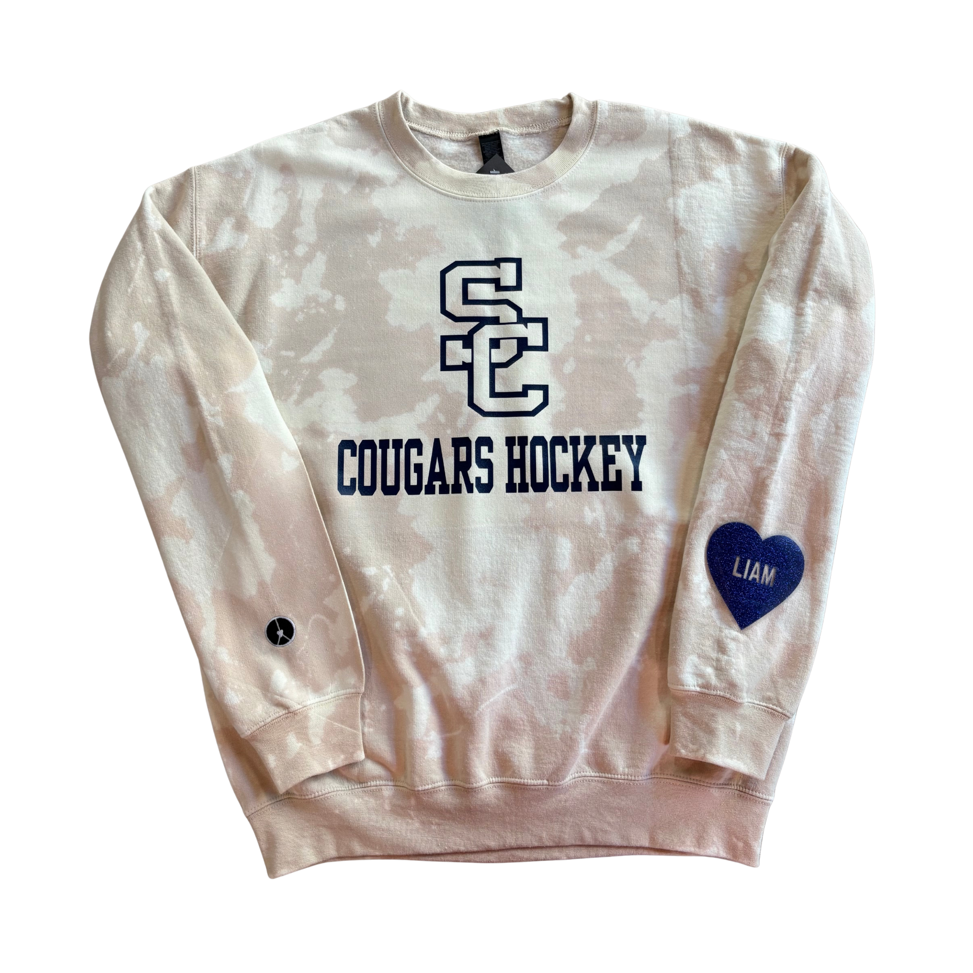 New tie-dye crewneck with SC cougars hockey in navy and option with customizable glitter heart sleeve