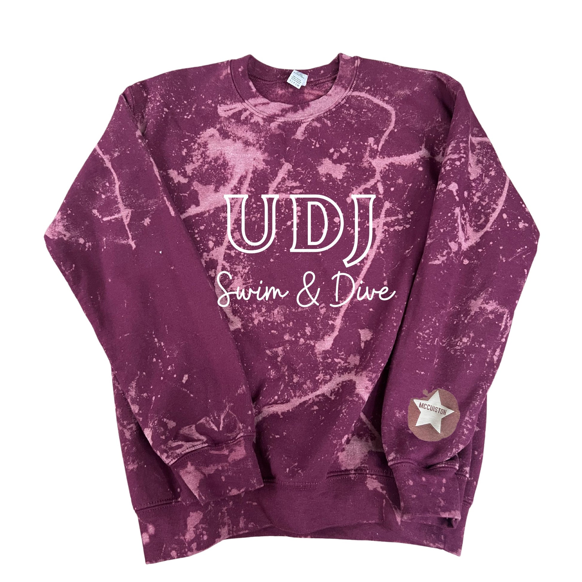 Sangria tie-dye crewneck sweatshirt with UDJ swim and dive in white and personalized star on sleeve