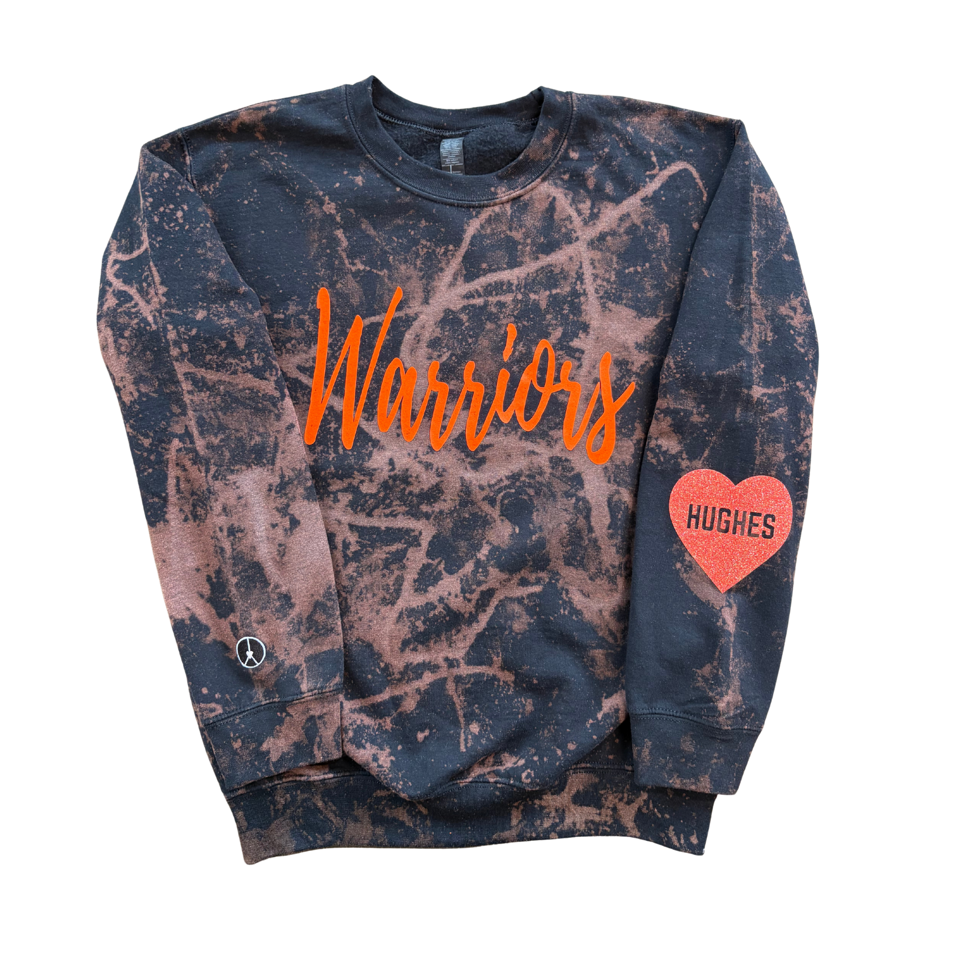 Black tie-dye crewneck with Warriors and neon, orange and option for customizable, orange glitter heart sleeve