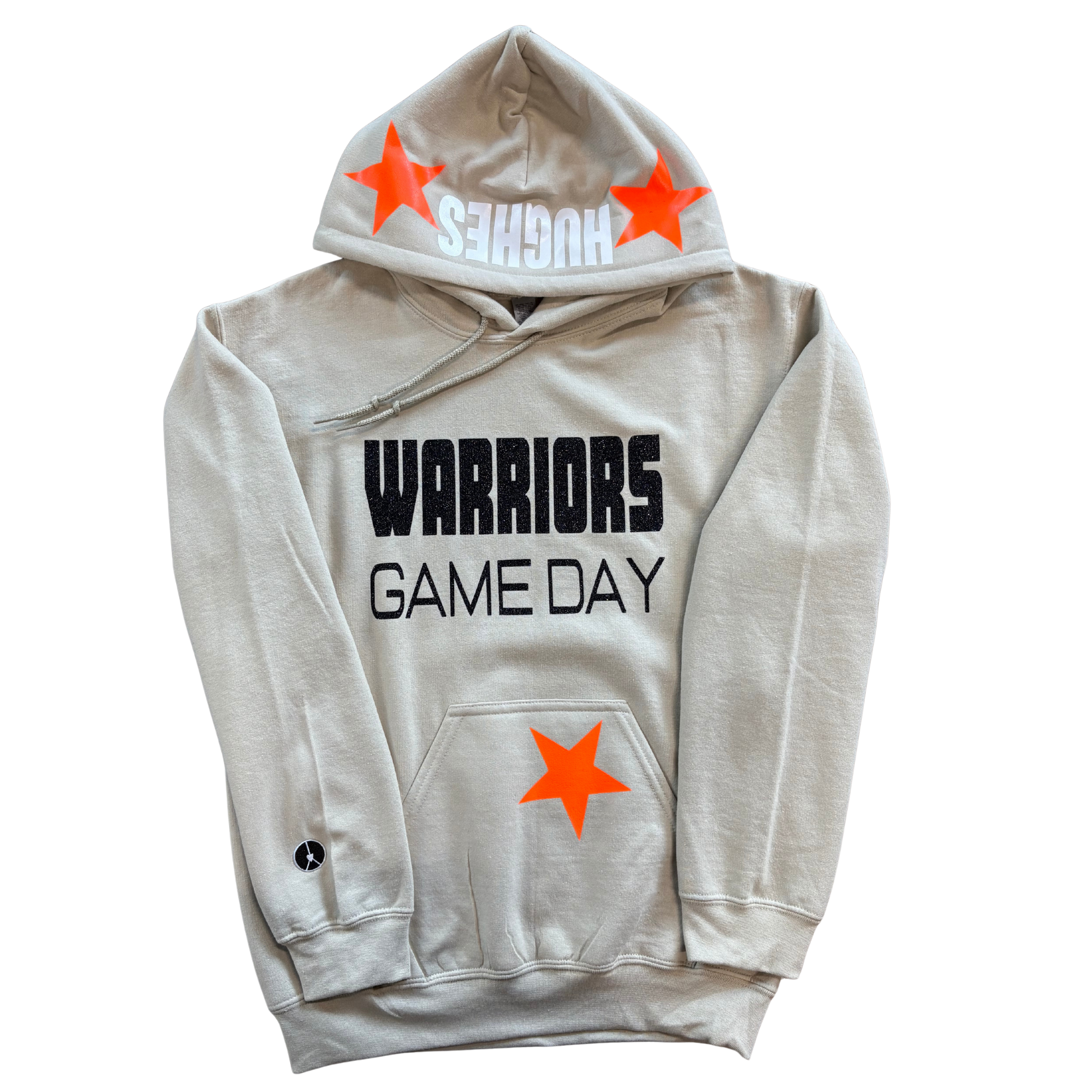 Nude Hoodie with Warriors game day in black glitter and orange neon stars with option to customize hood in white font