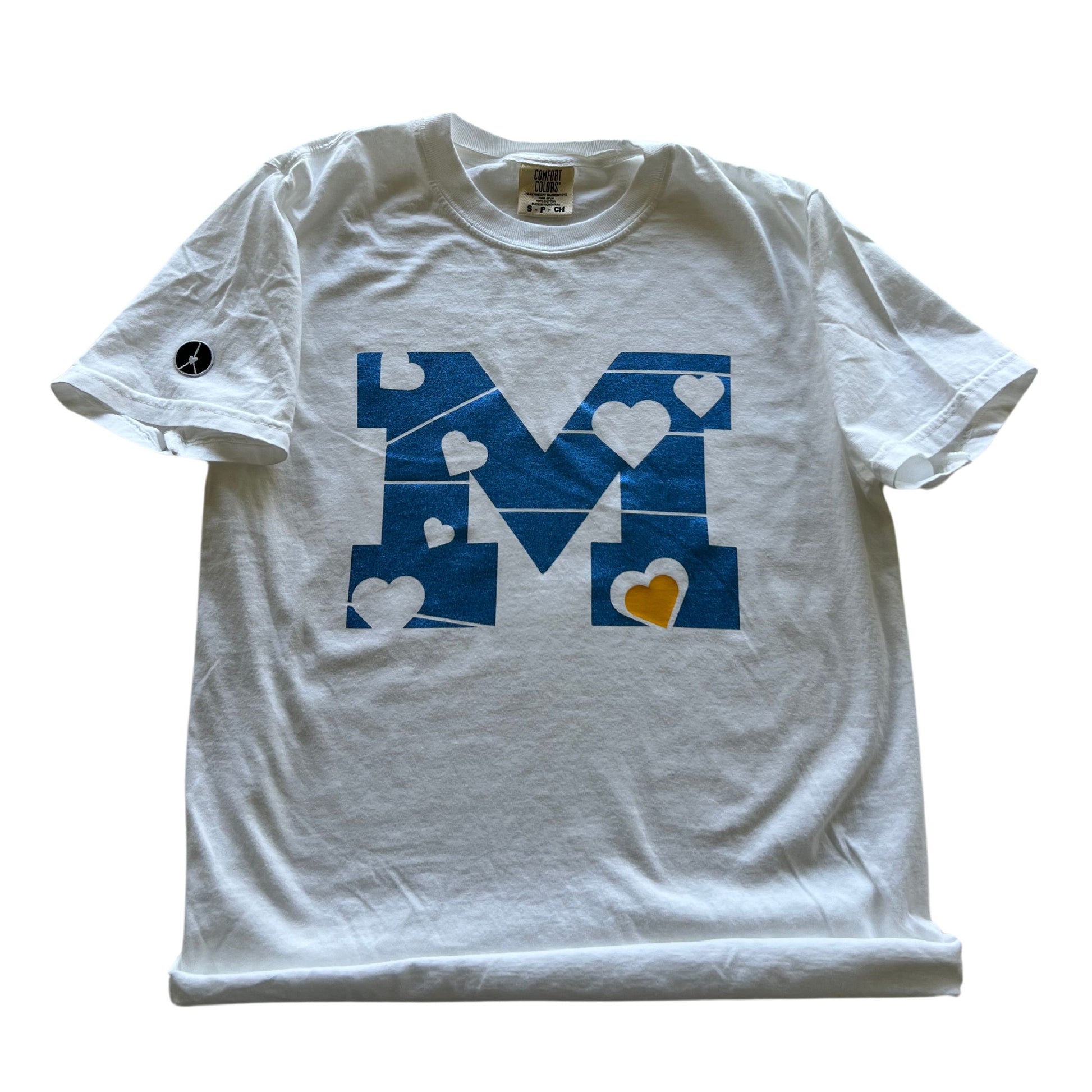White crewneck T-shirt with heart M in blue metallic and maize yellow